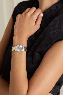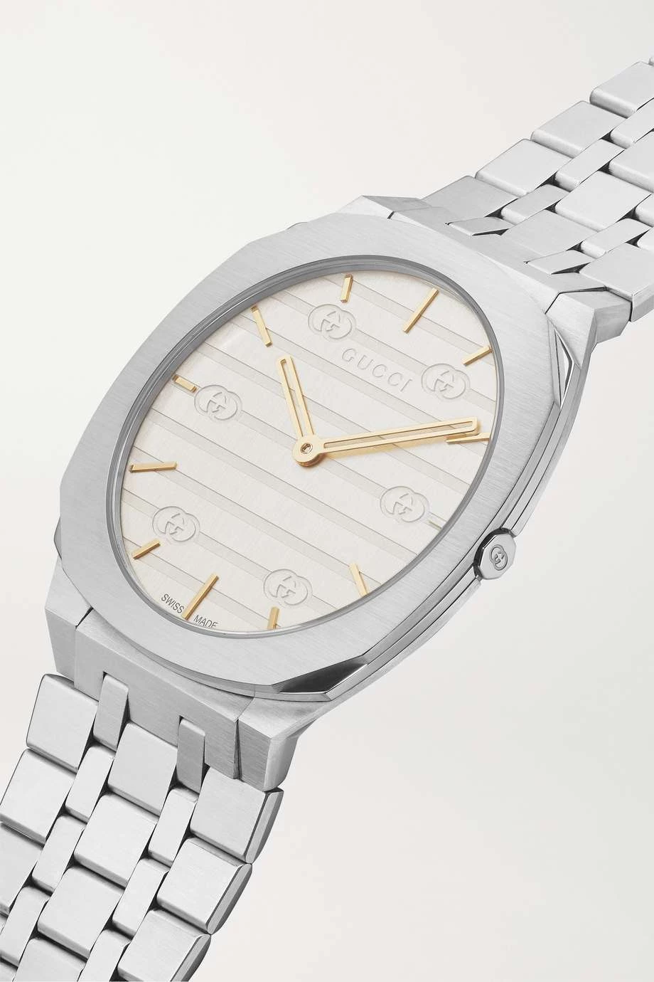 Die sportliche, ansprechend schmale „25H“ Uhr von Gucci wurde aus Edelstahl gefertigt und verströmt 70er-Jahre-Flair. Sie zeigt sich mit einem Zifferblatt im Sonnenschliff, das von Gravuren in Form des berühmten „GG“-Logos der Marke geziert wird. Der Zeitmesser hat ein Schweizer Quarzuhrwerk und ein Gliederarmband mit verdeckter Faltschließe, das besonders schlicht wirkt.