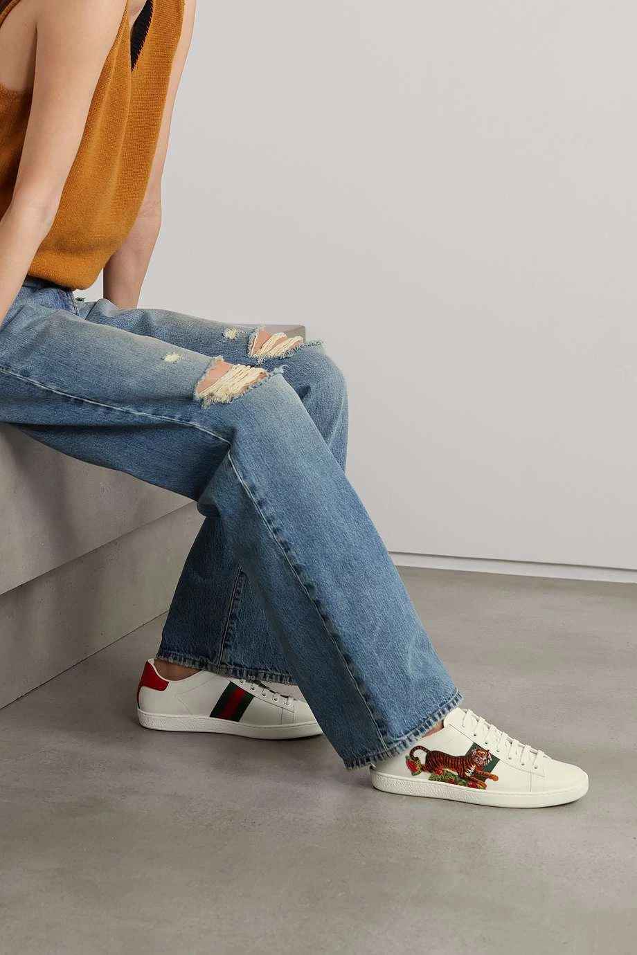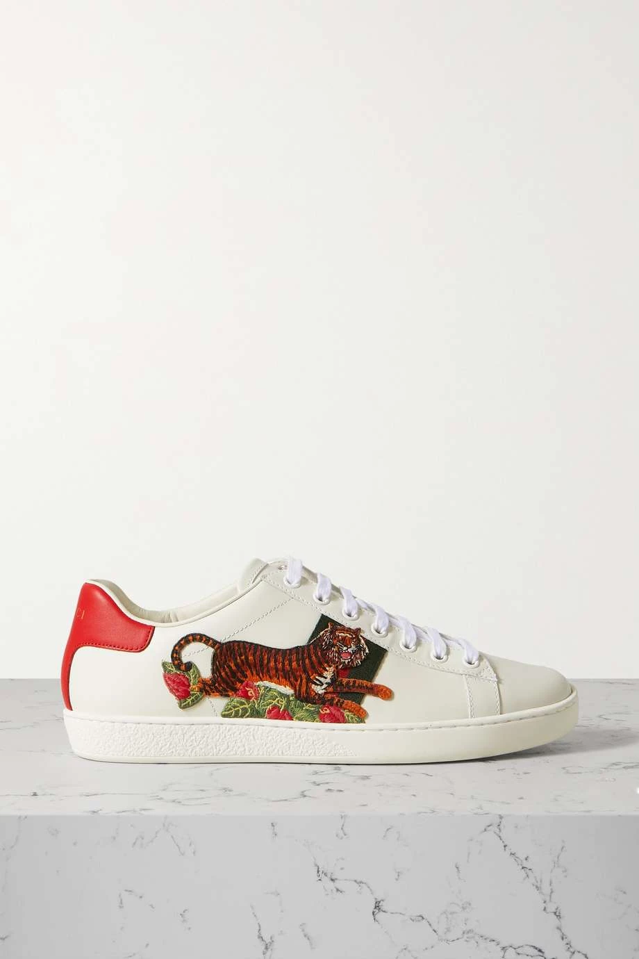 Die „Ace“ Sneakers von Gucci zeigen sich neben den markentypischen Webstreifen auch mit einer Applikation in Form eines Tigers – das Tier ist ein charakteristisches Motiv des Hauses und verweist darauf, dass Alessandro Michele eine Leidenschaft für die Natur hat. Das Low-Top-Paar wurde zur Feier des Mond-Neujahrs kreiert und besteht aus Leder in Weiß und Rot.