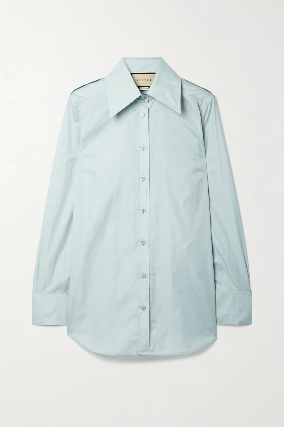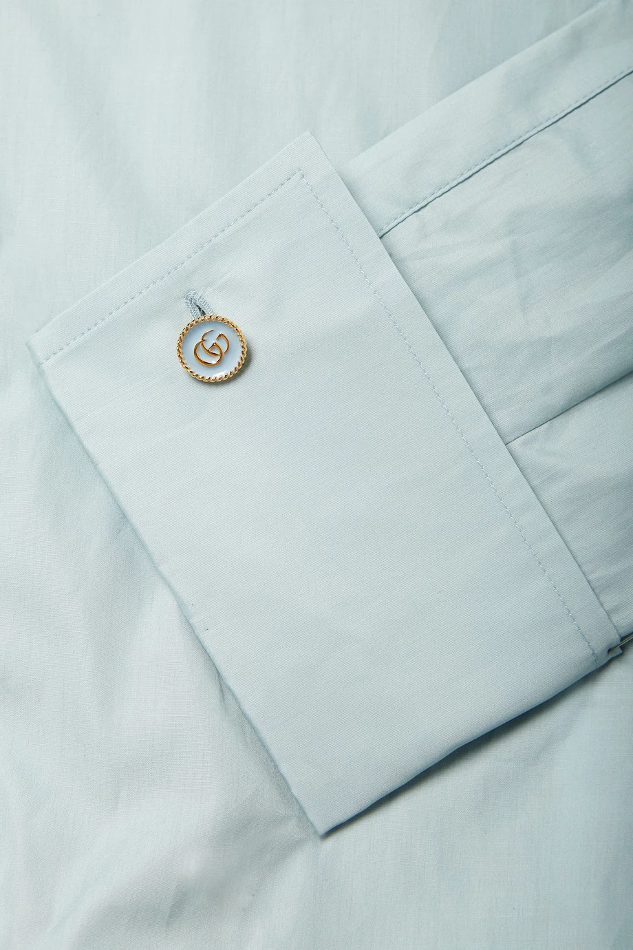 Dieses smarte, elegante Hemd von Gucci hat Epauletten und einen verstärkten Kragen, der stets in Form bleibt. Das lockere Modell wurde in Italien aus griffiger Baumwollpopeline gefertigt und an den Manschetten mit emaillierten goldglänzenden Knöpfen gestaltet, die das „GG“-Logo zeigen. Stecken Sie es beispielsweise in eine Anzughose der Marke.