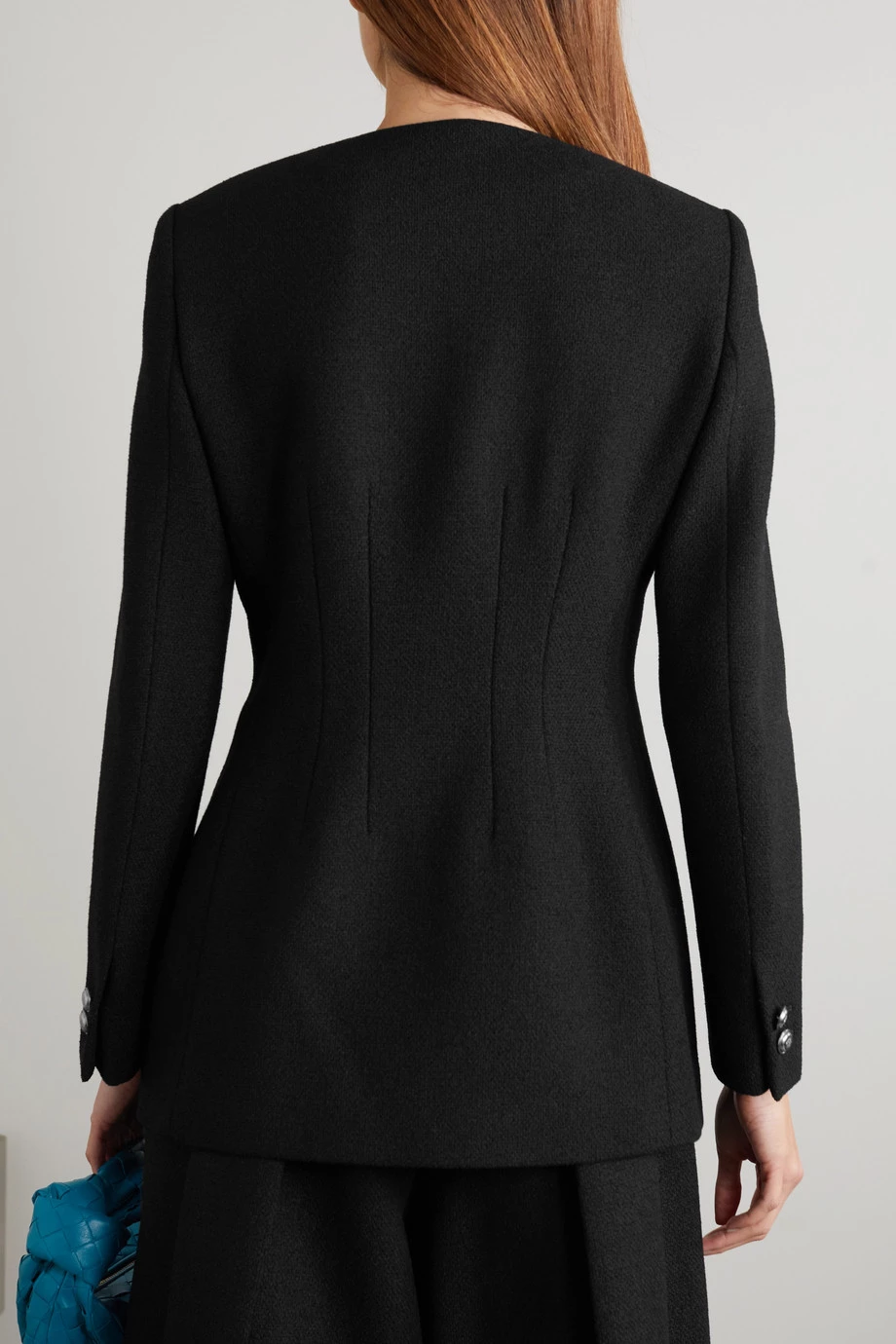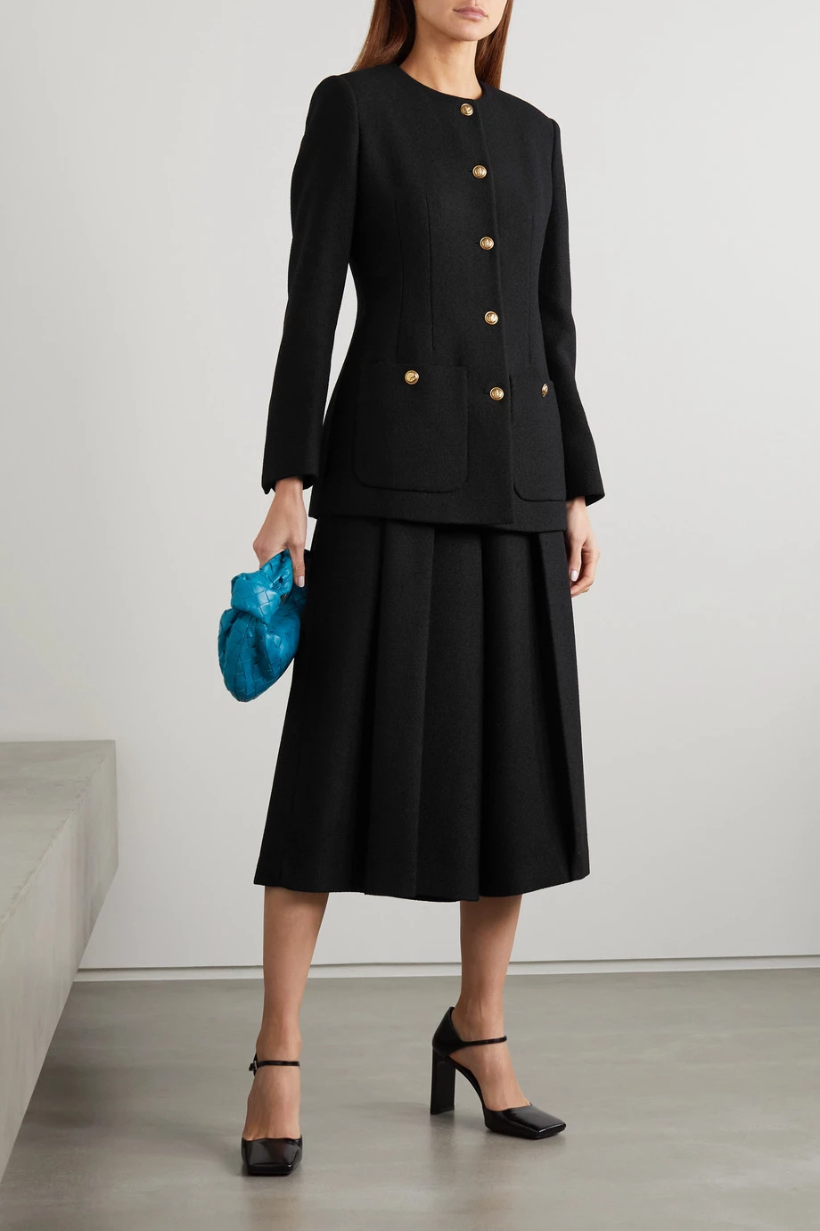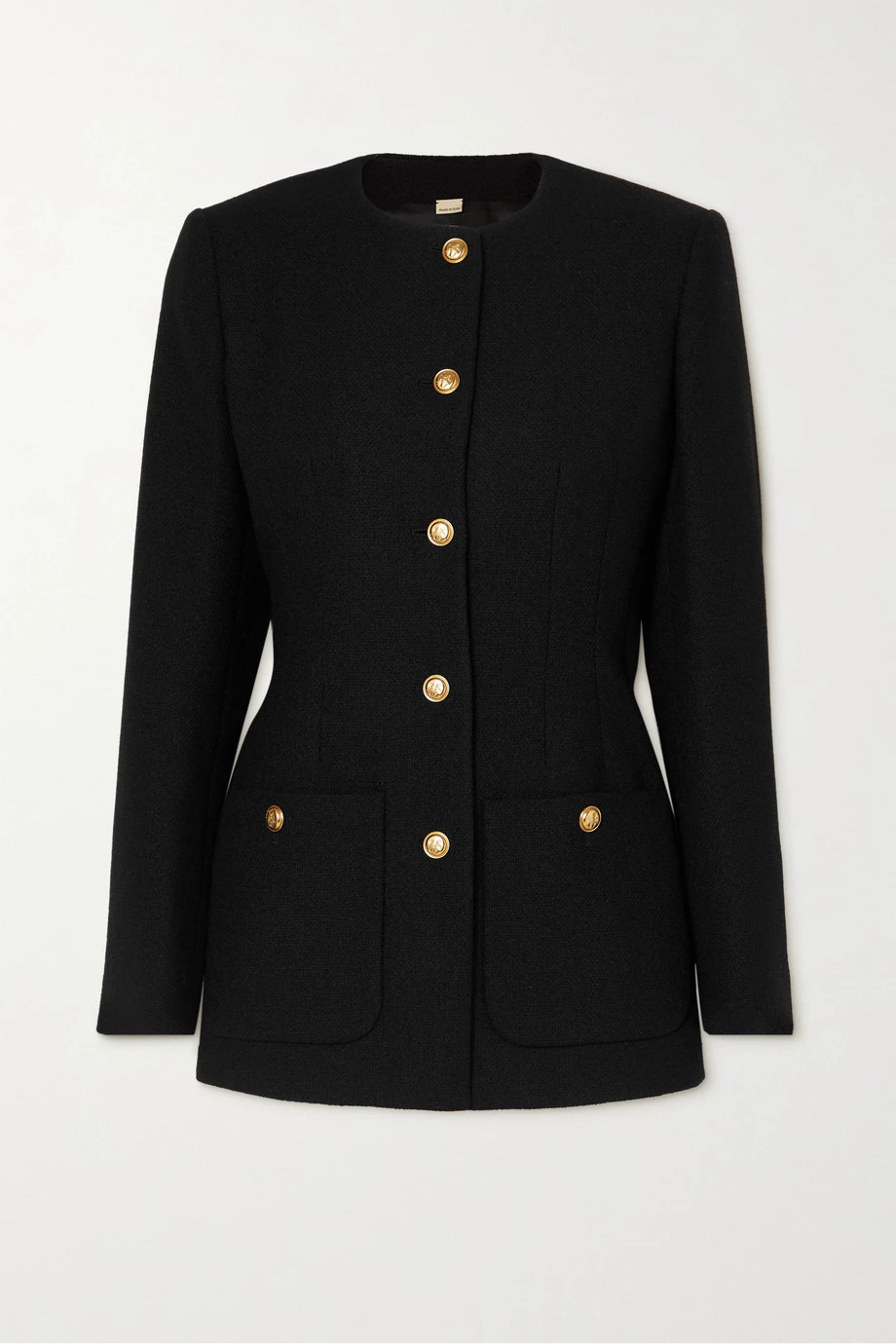 Die Vorlage für den Schnitt dieser Jacke fand Gucci im sagenumwobenen Archiv des Hauses. Das Modell, das vorne von Abnähern tailliert wird, wurde in Italien aus Tweed aus einer Wollmischung geschneidert und mit gravierten goldglänzenden Knöpfen vollendet. Tun Sie es der Marke gleich und kombinieren Sie es mit einem ebenfalls schwarzen Midirock.