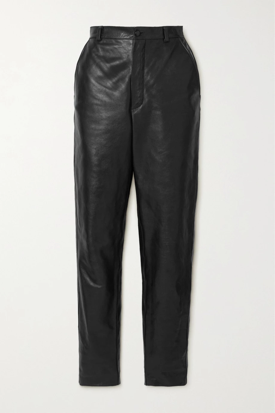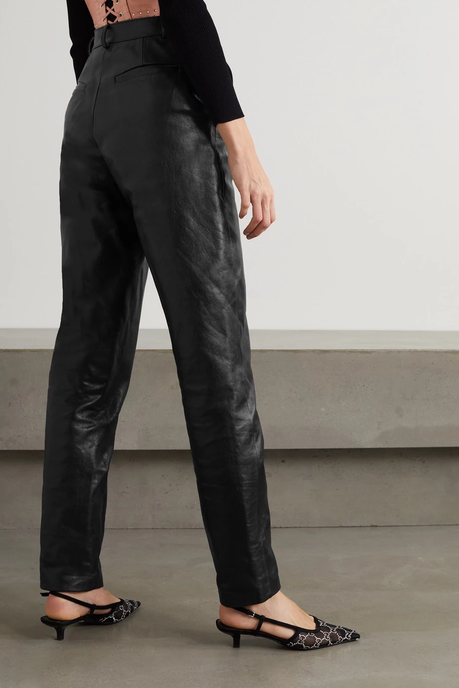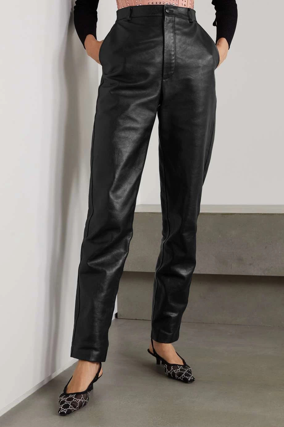Diese Saison wählte Alessandro Michele, Kreativdirektor von Gucci, Materialien mit einer düster romantischen Aura. Beispielsweise ließ er sich für diese Hose aus festem schwarzem Leder von durchtanzten Nächten in mysteriösen Clubs inspirieren. Das Modell mit klassischem schmal zulaufendem Bein harmoniert vor allem mit Heels.