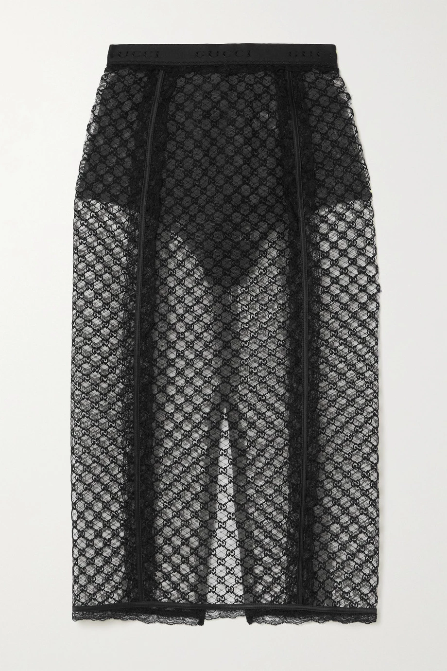 Dieser Midirock von Gucci wurde auf dem Resort-Laufsteg 2022 mit dem dazugehörigen Bustier und einem Harnischgürtel zu einem eindrucksvollen Outfit kombiniert. Zu Ehren ihres 100-jährigen Bestehens griff die Marke glamouröse, sinnliche Looks aus dem Archiv auf und gestaltete diesen Rock aus Tüll, der mit dem ikonischen „GG“-Muster bestickt ist, daher mit Spitzenbesätzen und korsettartigen, verstärkten Satinpartien. Dank des mitgelieferten Unterrocks können Sie selbst entscheiden, ob Haut durchscheinen soll.
