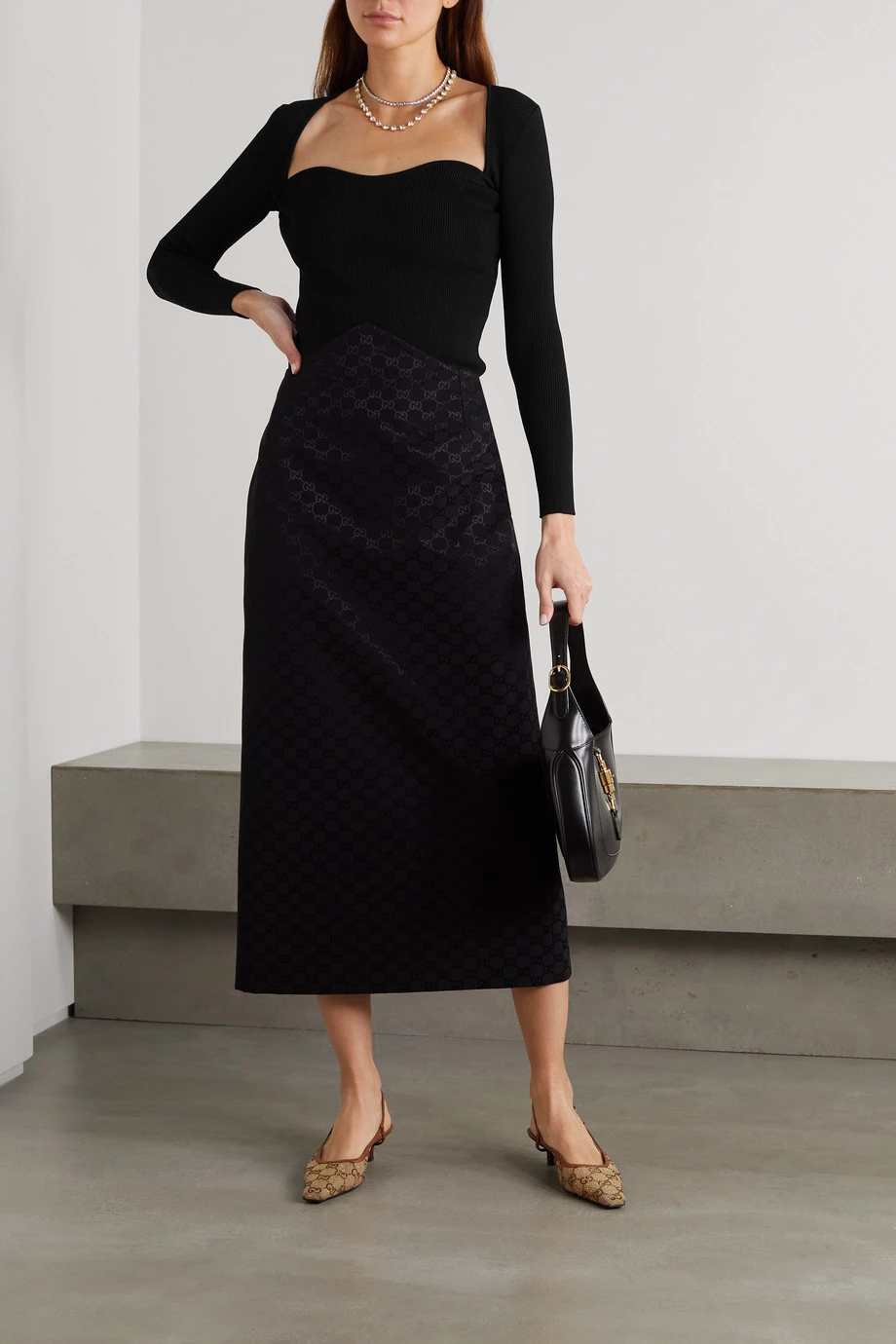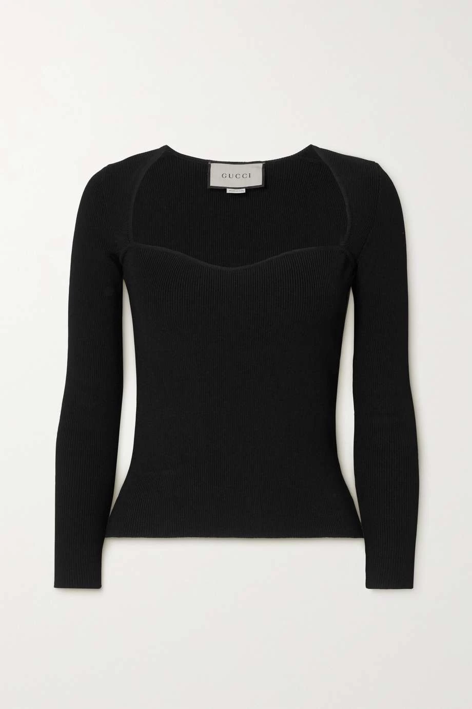 Sogar die Basics von Gucci lassen unser Herz höher schlagen. Dieses zeitlose schwarze Oberteil aus weichem Rippstrick hat einen Queen-Anne-Ausschnitt, der feminin wirkt und Vintage-Flair verströmt. Wenn Sie das pinkfarbene Bustier des Labels darüber ziehen, erhalten Sie ein besonders glamouröses Outfit.