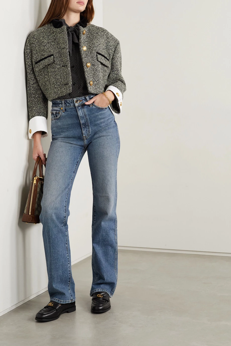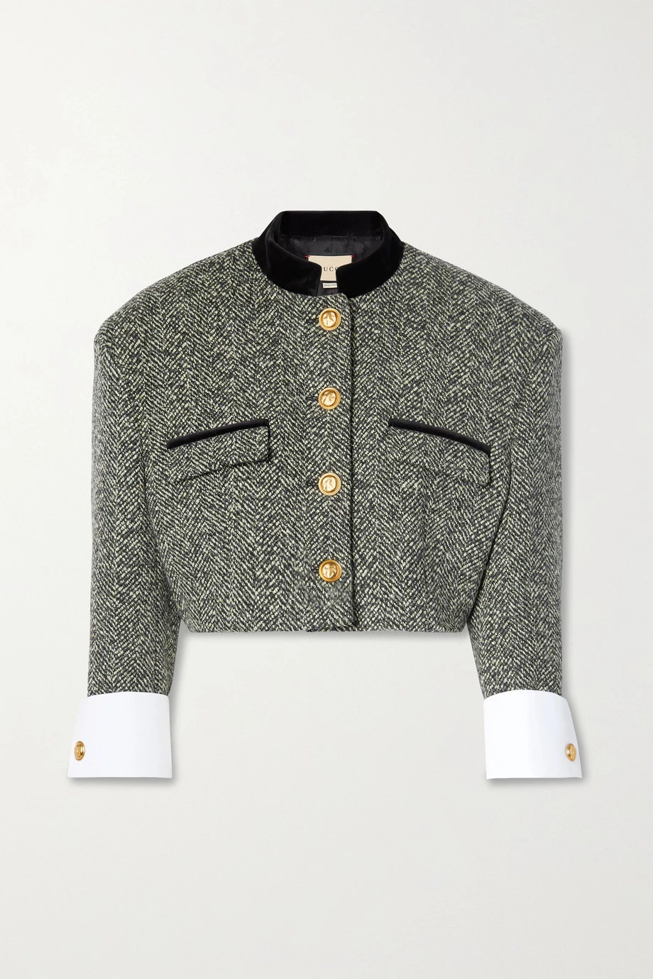 Die Resort-Kollektion 2022 von Gucci verweist auf den Reitsport, was auch für diese Jacke gilt, die an traditionelle Reitkleidung erinnert. Das verkürzte, kastenförmige Modell aus einer Wollmischung mit Fischgratmuster hat Schulterpolster und lässt sich dank des Futters aus glänzendem Twill problemlos über Oberteile ziehen. Es zeigt sich neben Bündchen aus Baumwolle und einem Stehkragen aus Samt auch mit schicken goldglänzenden Knöpfen mit Logoprägung.