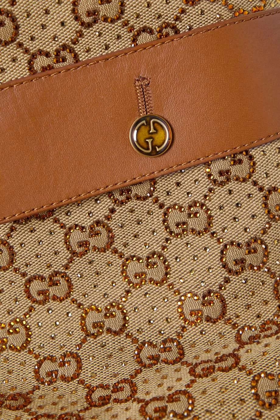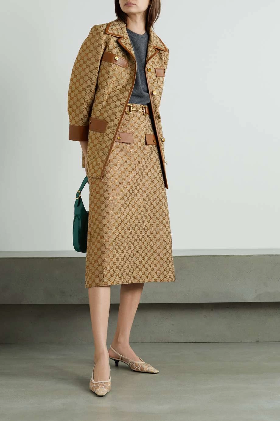 Fans der Marke Gucci werden von diesem Midirock des Hauses besonders angetan sein. Das Modell besteht aus Canvas aus einer Baumwollmischung, der mit dem ikonischen „GG“-Logo bedruckt ist, und zeigt sich mit kleinen Kristallen. Das charakteristische „Horsebit“-Detail und das Webband kommen mit einem eingesteckten Oberteil besonders gut zur Geltung.