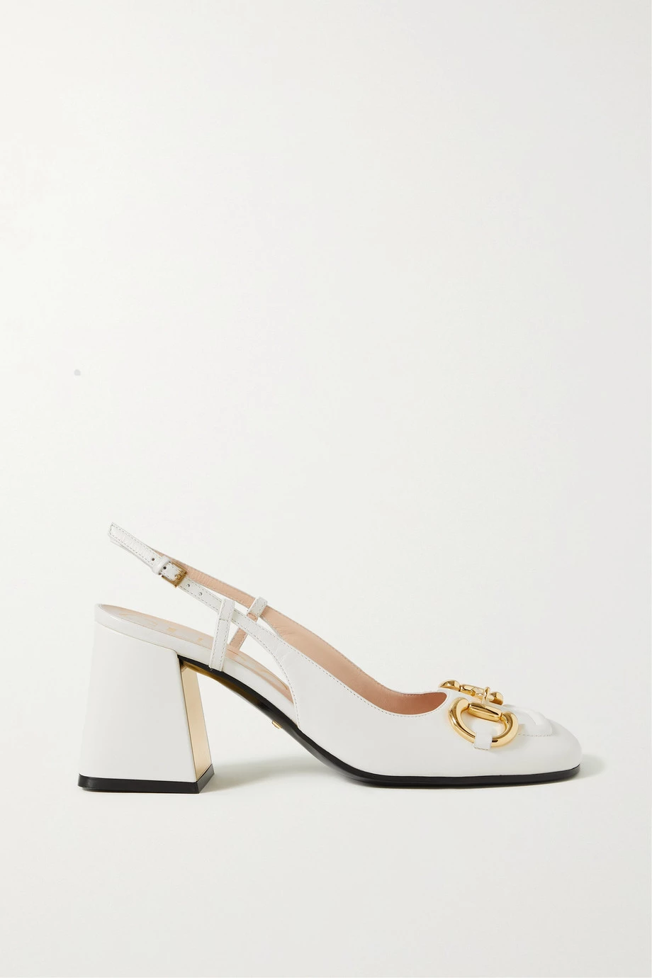 Die femininen „Baby“ Pumps von Gucci verströmen eindeutig Retro-Flair. Diese in Italien gefertigte Version aus Leder in Cremeweiß zeigt sich mit einer Schnalle am Slingback-Riemen sowie einer karreeförmigen Kappe, die mit dem markentypischen goldfarbenen „Horsebit“-Detail besetzt ist. Verkürzte Hosen und Röcke bringen den skulpturalen Blockabsatz besonders gut zur Geltung.