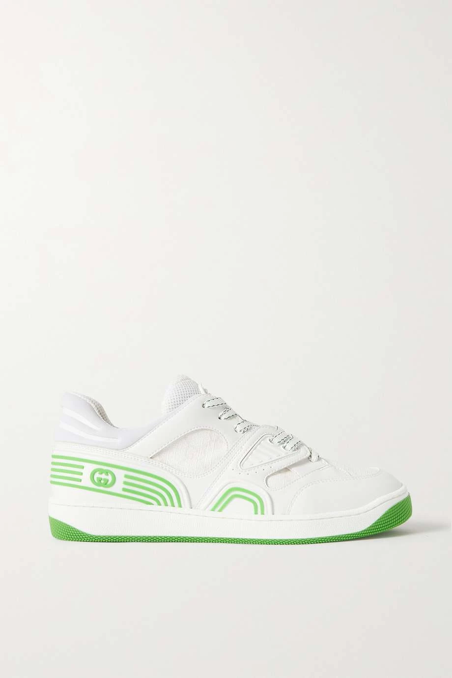 Die „Basket“ Sneakers von Gucci basieren auf klassischen Basketballschuhen aus den 90er-Jahren. Sie wurden in Italien aus Kunstleder sowie Partien aus „GG Supreme“-Canvas gefertigt und mit grünen Gummiakzenten gestaltet. Das Paar hat zudem eine strukturierte Sohle und ist innen angenehm gepolstert.