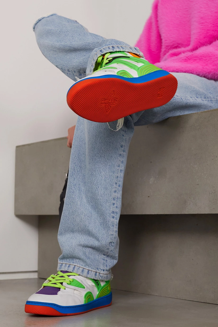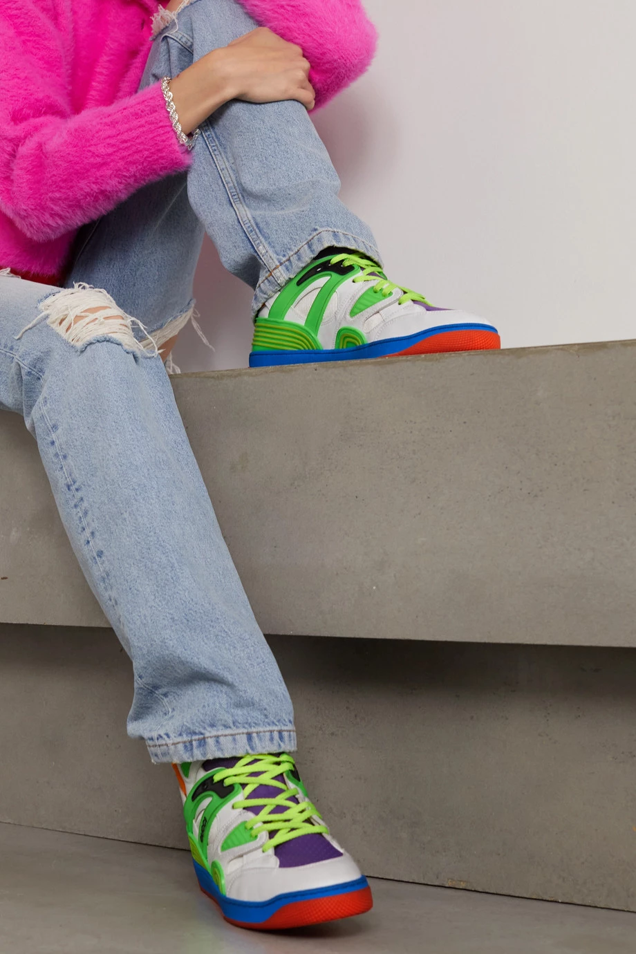 Diese Sneakers von Gucci sind an die neonfarbenen Basketballschuhe der 90er-Jahre angelehnt. Das in Italien gefertigte High-Top-Paar hat einen wattierten Schaft und besteht aus Mesh sowie weichem, langlebigem „Demetra“-Kunstleder – Letzteres wurde zwei Jahre lang von der Marke entwickelt.