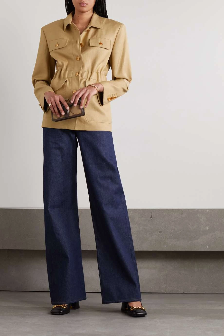 Utility-Jacken gelten bereits seit Jahrzehnten als Klassiker. Diese Version von Gucci besteht aus Crêpe mit einem Leinenanteil, der für Luftigkeit und natürliche Struktur sorgt. Die Ärmel und Taille werden durch kunstvolle Raffungen betont.