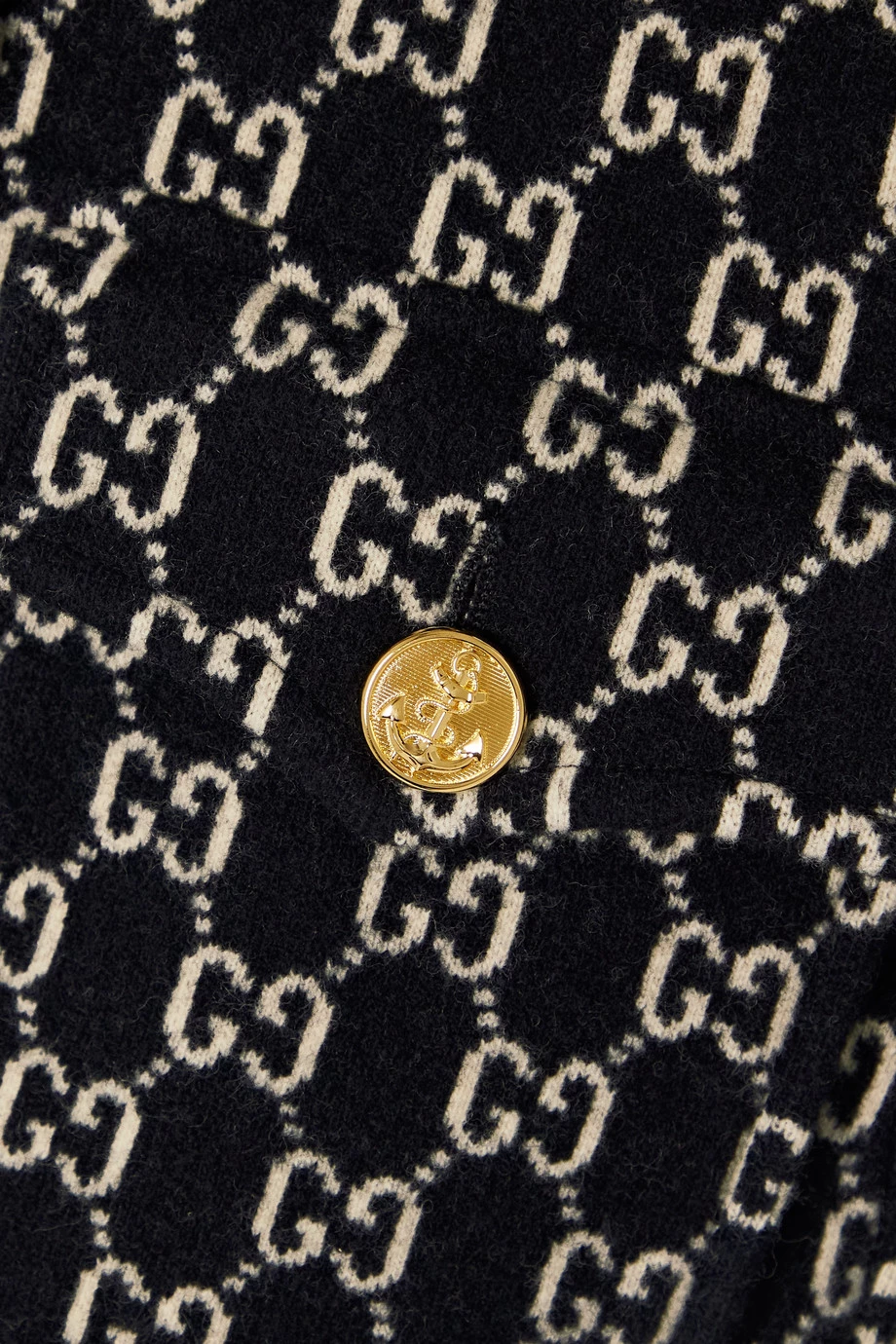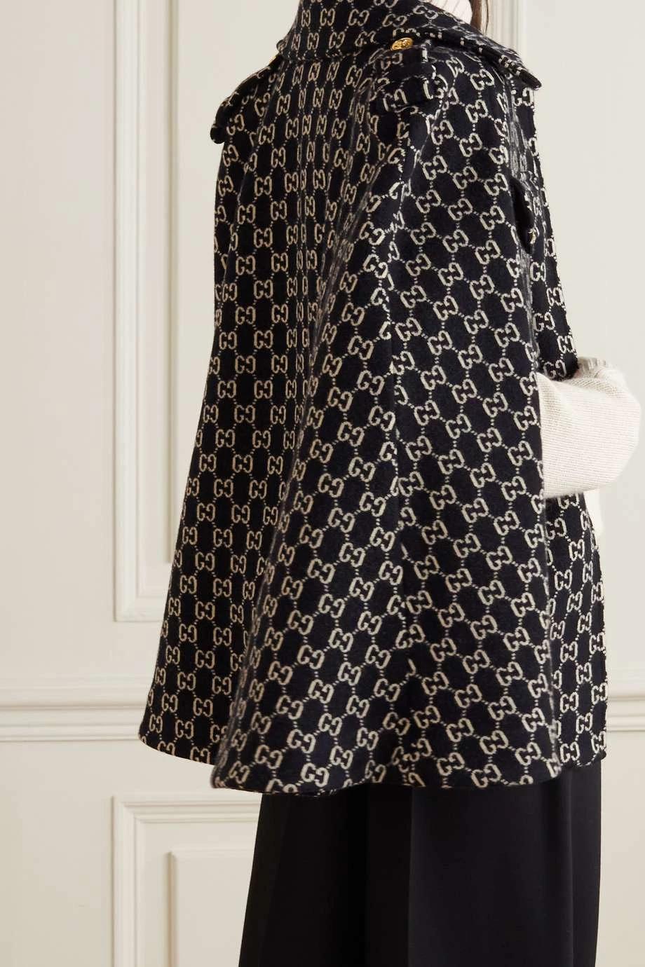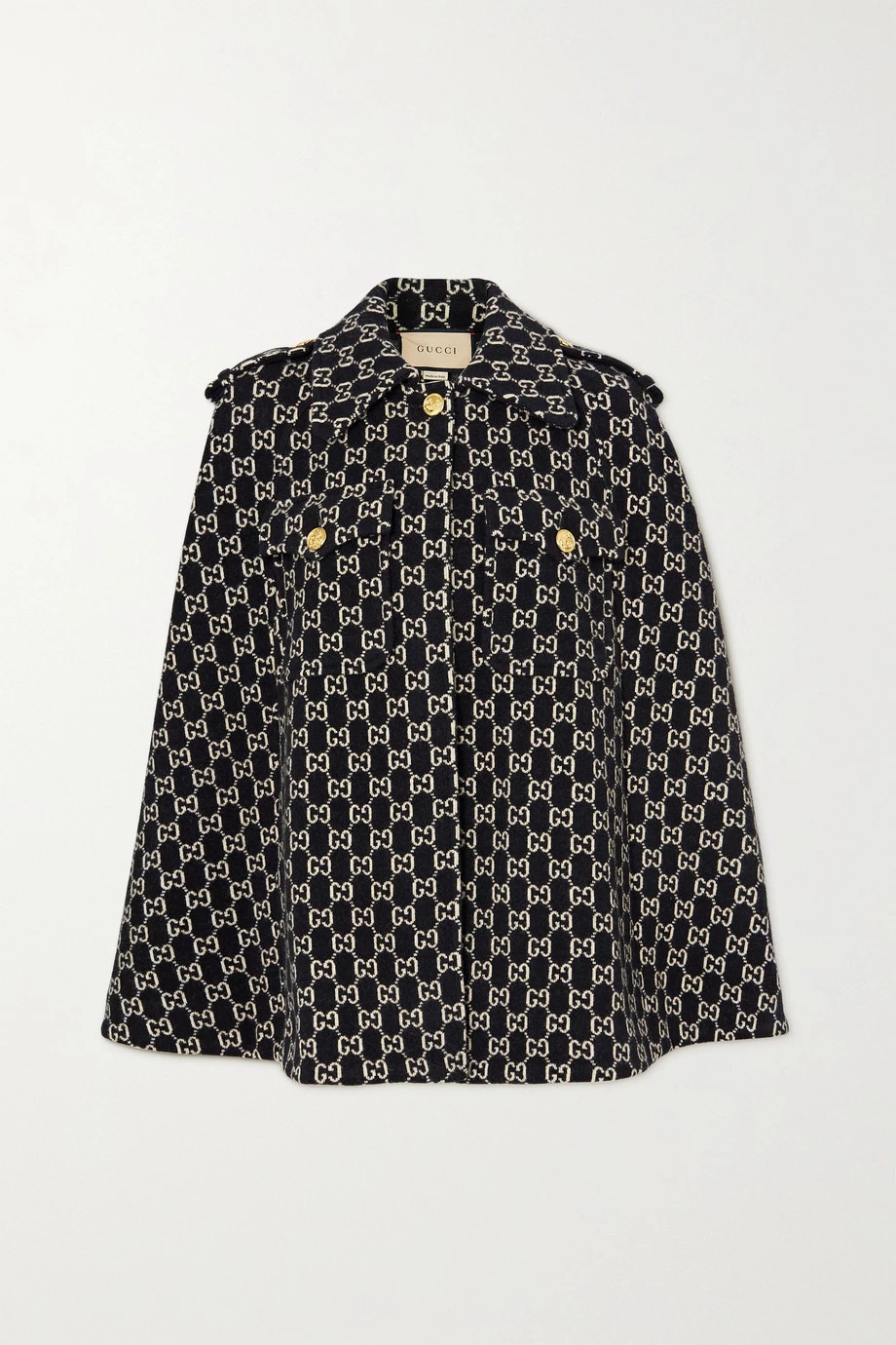 Dieses Cape stammt aus der „Epilogue“ Kollektion von Gucci, die eine Ode an die zeitlosesten Modelle und Muster der letzten fünf Jahre unter der Leitung von Alessandro Michele darstellt. Es wurde in Italien aus wärmendem Woll-Jacquard gefertigt und mit dem „GG“-Motiv aus dem Archiv des Hauses gestaltet. Zudem zeigt es sich mit goldfarbenen Knöpfen, die mit einem Anker geprägt sind.