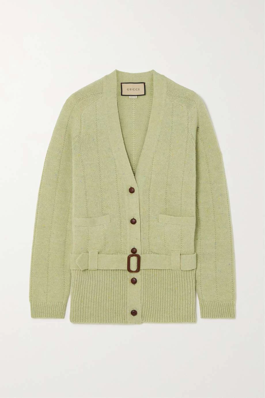 Alessandro Michele hat eine Vorliebe für verspielte Retro-Modelle, weshalb Knitwear mit Vintage-Flair bei Gucci einfach dazu gehört. Dieser farbenfroh melierte Cardigan aus weicher Wolle wurde mit braunen Lederknöpfen gestaltet, die zur Gürtelschnalle passen, und hinten mit der Zahl „1921“ bestickt – das Jahr, in dem Guccio Gucci die Marke gründete.