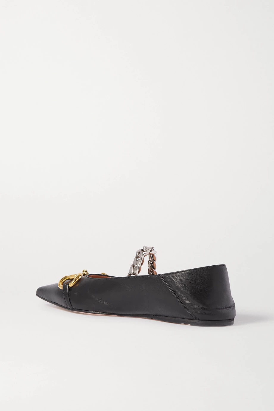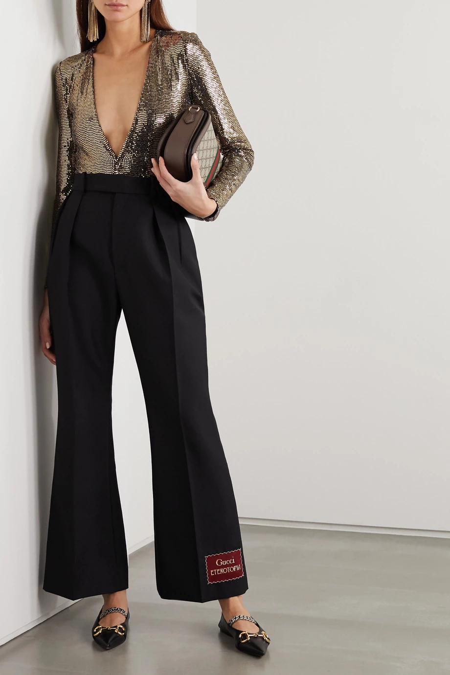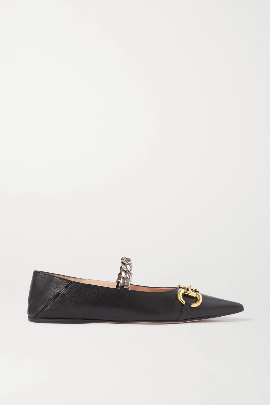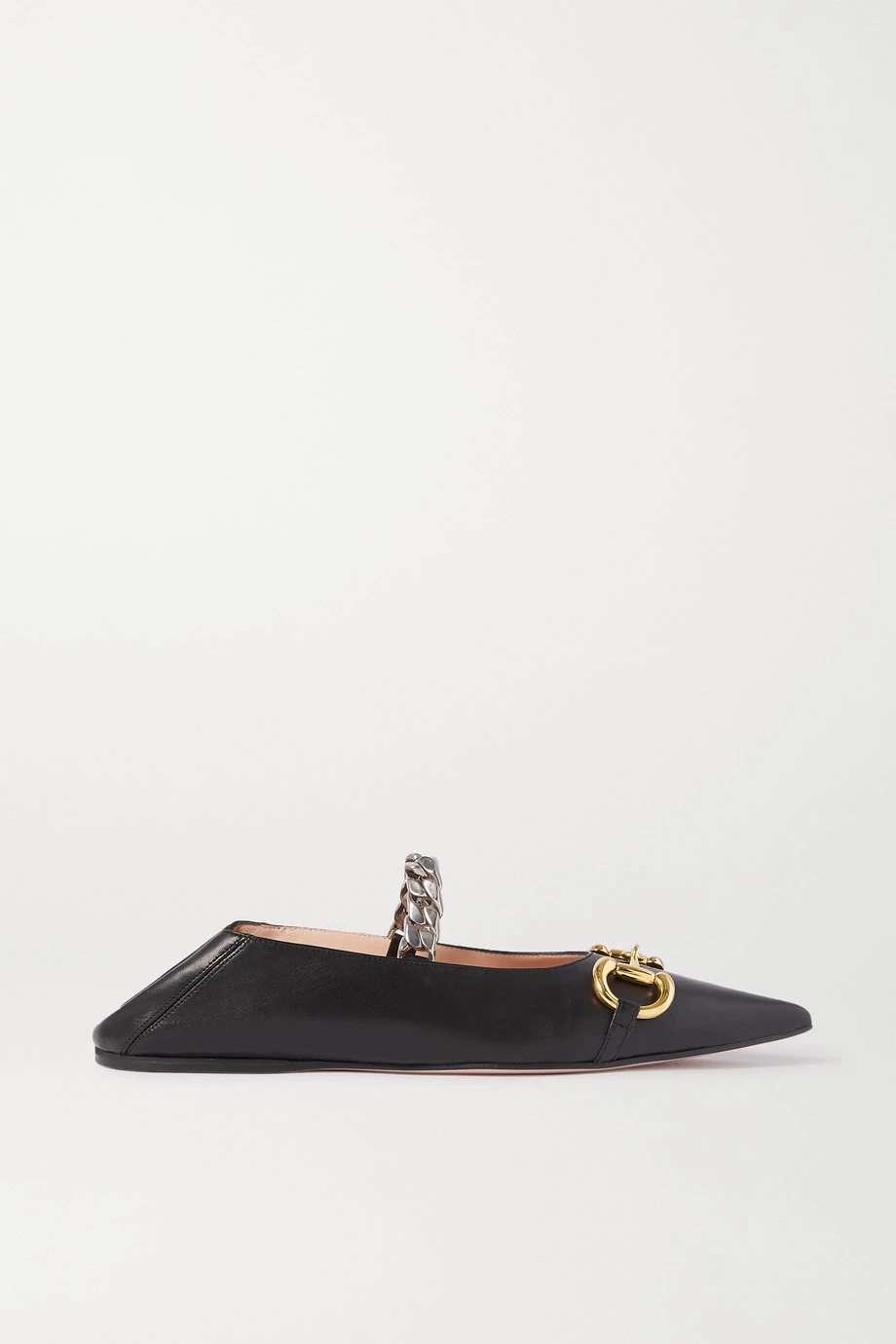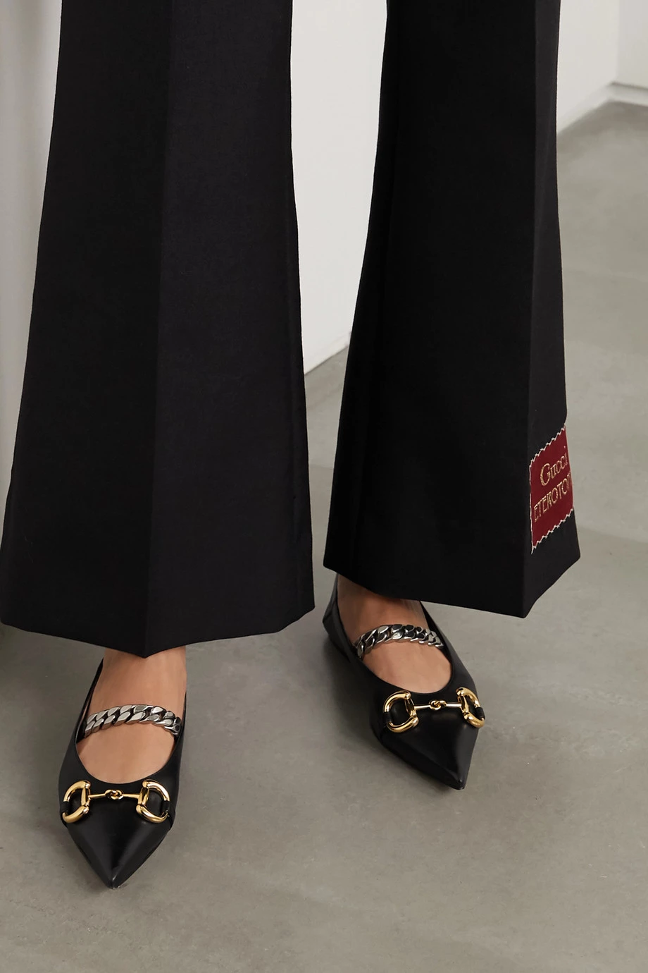 Die „Deva“ Ballerinas mit spitzer Kappe wurden bei der F/S 20-Laufstegshow von Gucci in Kombination mit verschiedenen Outfits wie Anzügen oder Bohème-Kleidern gezeigt. Das Paar aus geschmeidigem Leder zeichnet sich durch das ikonische goldglänzende „Horsebit“-Detail des Hauses und einen silberfarbenen Kettenriemen am Spann aus. Dank der einklappbaren Fersenpartie können Sie es auch als Slippers tragen