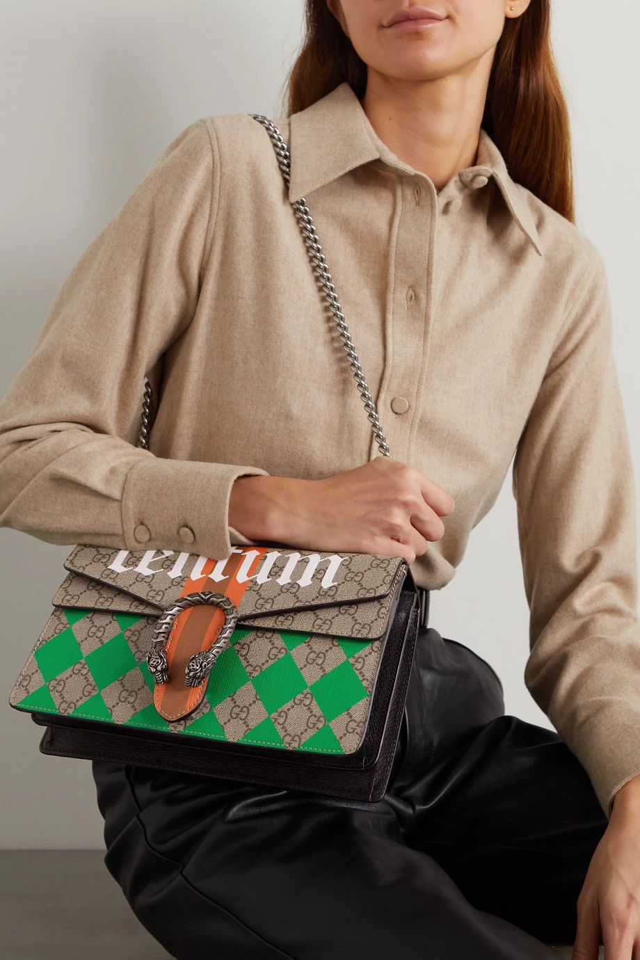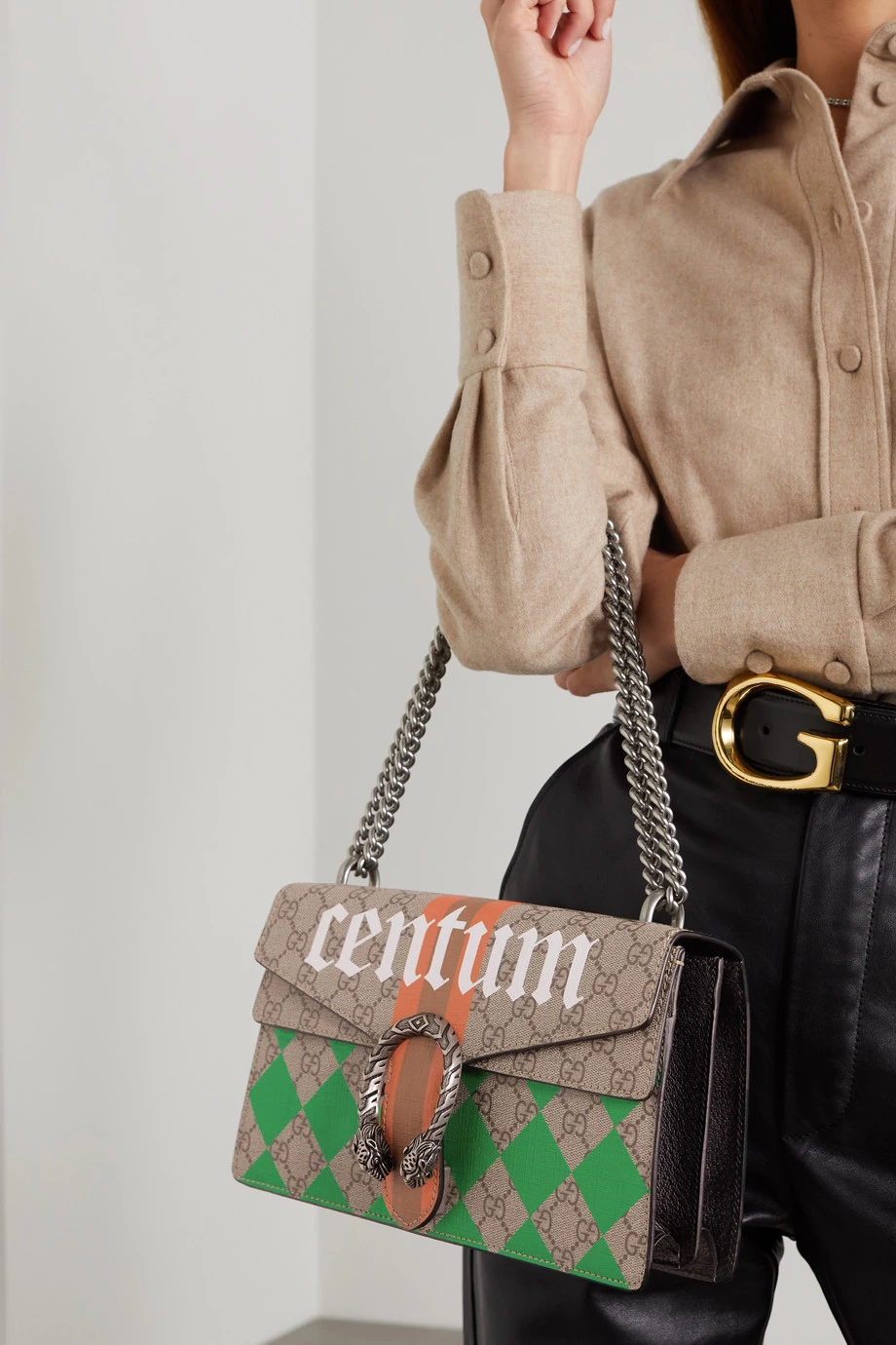 Mit seiner Kollektion für F/S 2022 zollt Alessandro Michele dem traditionsreichen Modehaus Gucci den ihm gebührenden Respekt – als Verweis auf die hundert Jahre, die seit der Markengründung vergangen sind, ist diese Version der immer noch beliebten „Dionysus“ Tasche mit dem Wort „Centum“ bedruckt. Zudem zeigt sich das Modell aus beschichtetem Canvas und schwarzem strukturiertem Leder mit Akzenten in den labeltypischen Farben Grün und Rot. Im Inneren befinden sich mehrere Fächer.