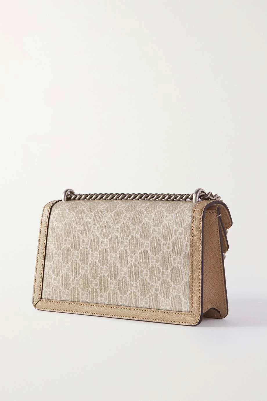 Die „Dionysus“ Schultertasche von Gucci zeigt sich mit silberglänzenden Details und hat am Verschluss Tigerkopfmotive, für welche die griechische Mythologie als Inspiration diente. Das formstabile Modell aus dem markentypischen beschichteten Canvas mit Monogrammmuster wurde neben Lederbesätzen auch mit einem verstellbaren Kettenriemen gestaltet. Es bietet ausreichend Platz für Smartphone, Portemonnaie und Schlüssel.