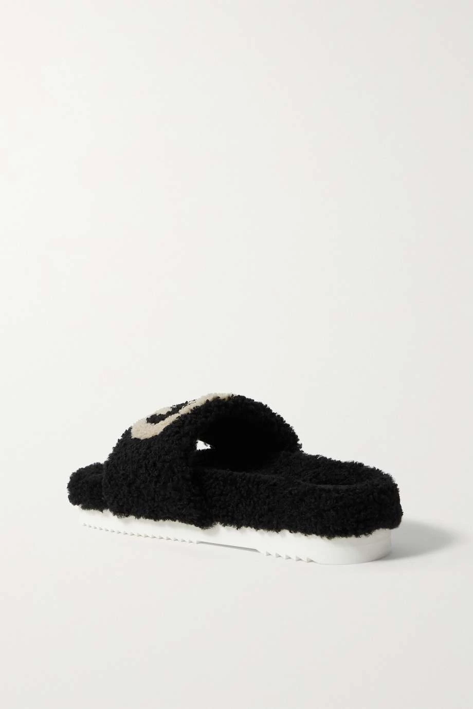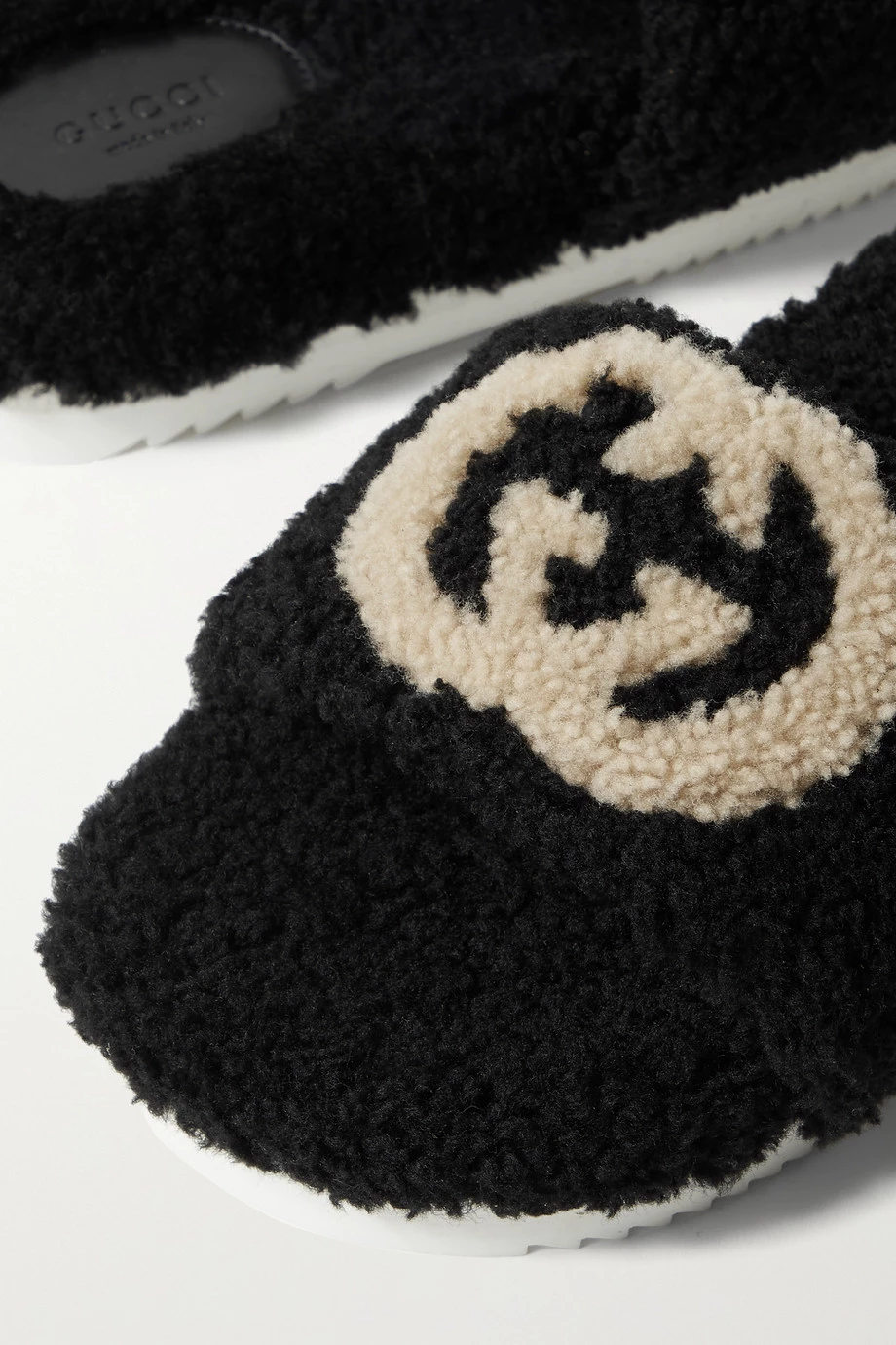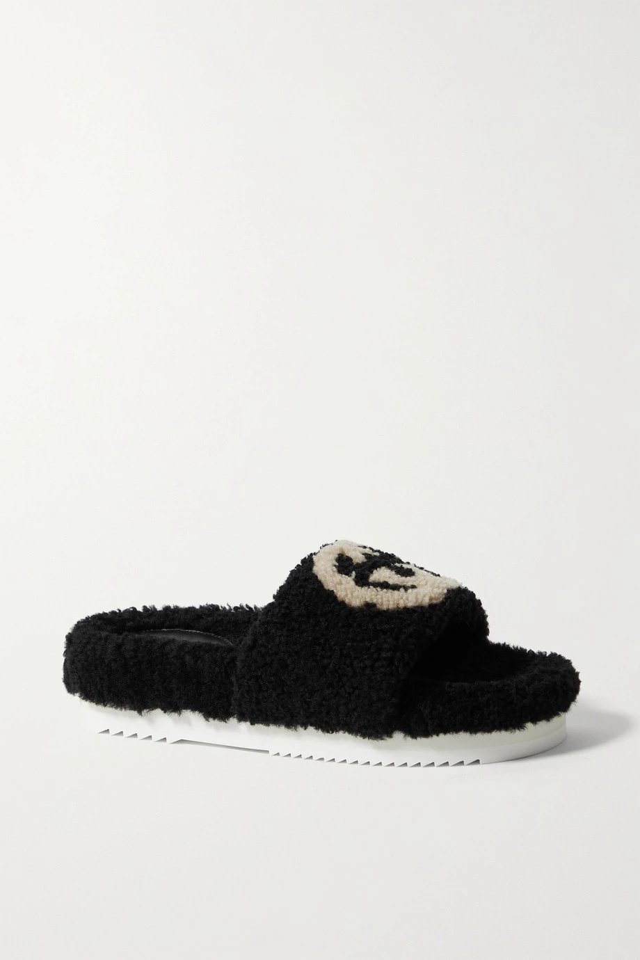 Die bequemen „Eileen“ Slides von Gucci wirken besonders luxuriös, weshalb man sie sowohl zu Hause als auch auf der Straße tragen kann. Das in Italien gefertigte Paar aus weichem Shearling hat einen gepolsterten Fersenbereich und einen breiten Riemen, der mit dem berühmten „GG“-Logo der Marke bedruckt ist.