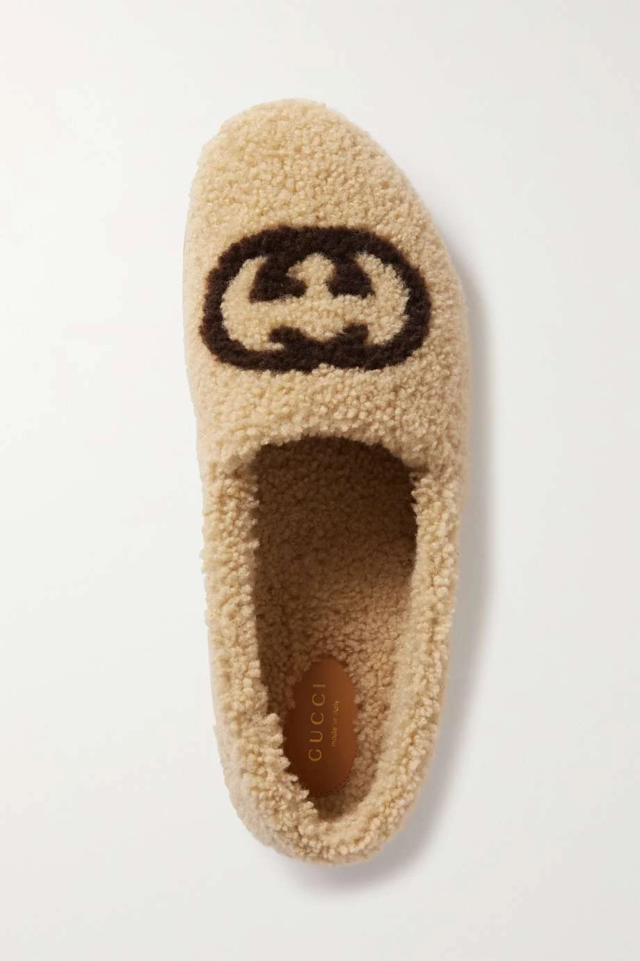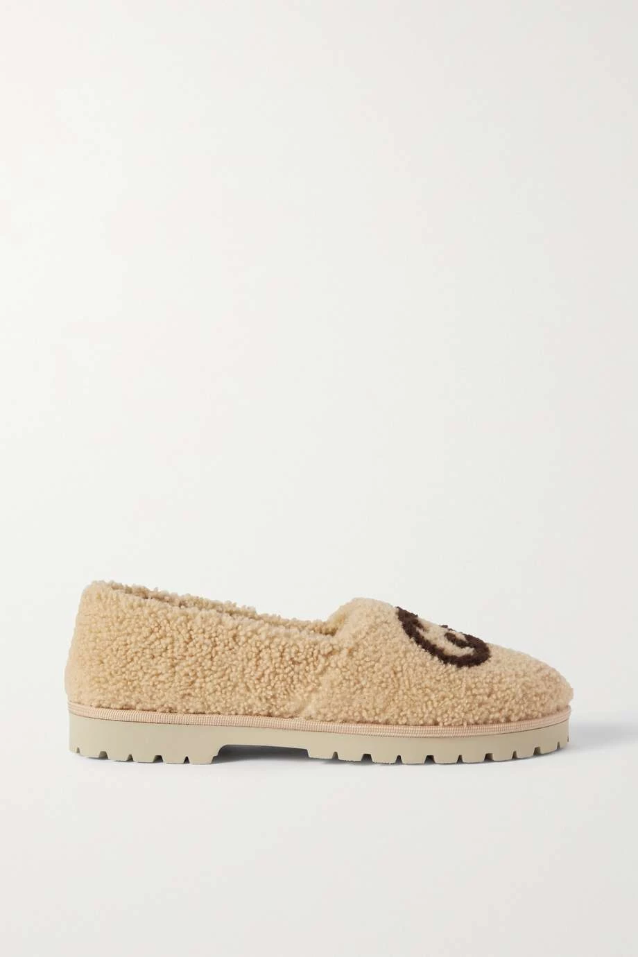 Diese flachen Schuhe von Gucci erwecken das Gefühl, als würden Sie auf Wolken gehen. Das Paar besteht aus beigefarbenem Shearling und zeigt sich mit dem „GG“-Logoprint sowie einer markanten Profilsohle. Tragen Sie eine verkürzte Hose, eine Jeans oder ein Minikleid dazu.