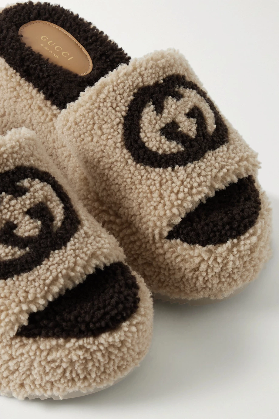Die „Elea“ Pantoletten von Gucci bestehen aus beigefarbenem Shearling und ruhen auf einem Plateau im 90er-Jahre-Stil, wobei eine gezackte Gummisohle für Halt sorgt. Auf dem Riemen findet sich zudem das „GG“-Logo in kontrastierendem Braun. Tragen Sie das Paar zu einem smarten Rock oder einer Jeans.