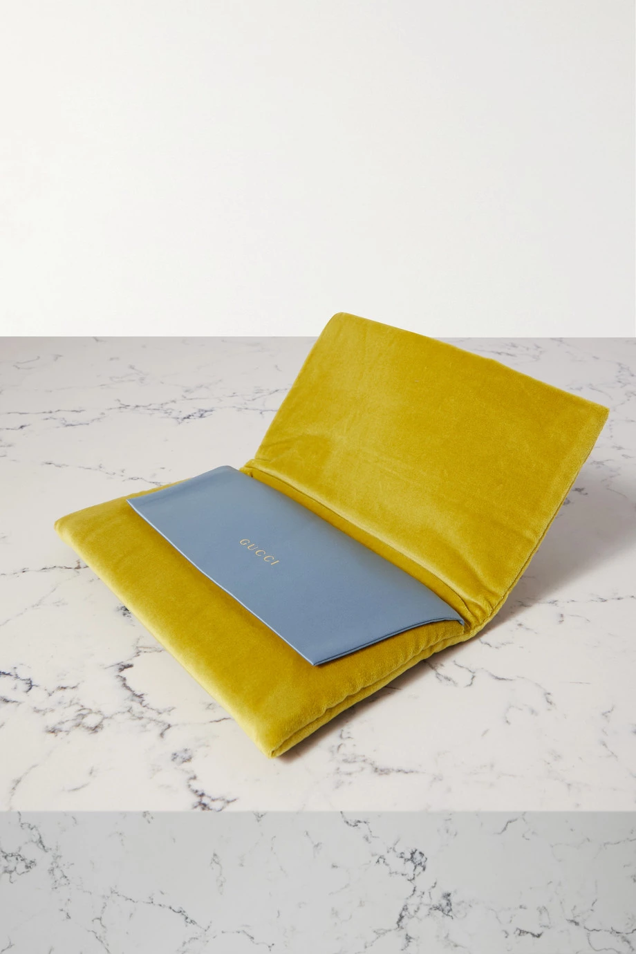Diese Brille von Gucci Eyewear verleiht schlichten Outfits dank des Oversized-Rahmens elegantes Flair. Das Accessoire besteht aus goldfarbenem Metall und hat braune Gläser. Befestigen Sie die „GG“-Anhänger aus Azetat in Hornoptik an den Bügelenden – sie reichen bis zum Kiefer.