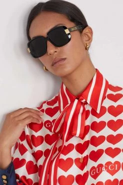 Diese Sonnenbrille von Gucci wurde in Italien mit einem runden Rahmen im Retro-Stil gefertigt, der aus Azetat in schicker Hornoptik besteht. Sie hat braune Gläser und zeigt sich an den Bügeln mit dem goldfarbenen Markenlogo. Im beiliegenden Etui bleibt das Accessoire vor Kratzern geschützt, wenn Sie es gerade nicht tragen.