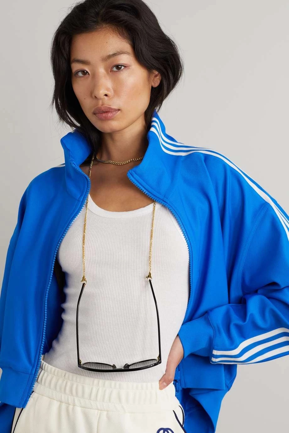 Diese Pilotensonnenbrille von Gucci Eyewear verströmt zwar Retro-Flair, wirkt zugleich aber auch zeitgemäß und cool. Das in Italien gefertigte Accessoire aus glänzendem Azetat hat getönte Gläser und Details aus goldfarbenem Metall wie etwa das „GG“-Logo an den Seiten. Die Bügel wurden außerdem mit Löchern gestaltet, an denen Sie wahlweise die beiliegende Kette befestigen können.