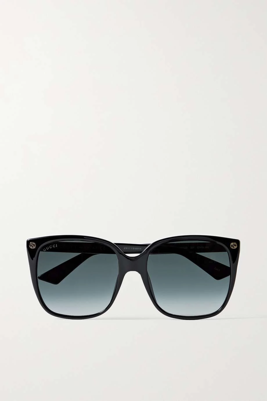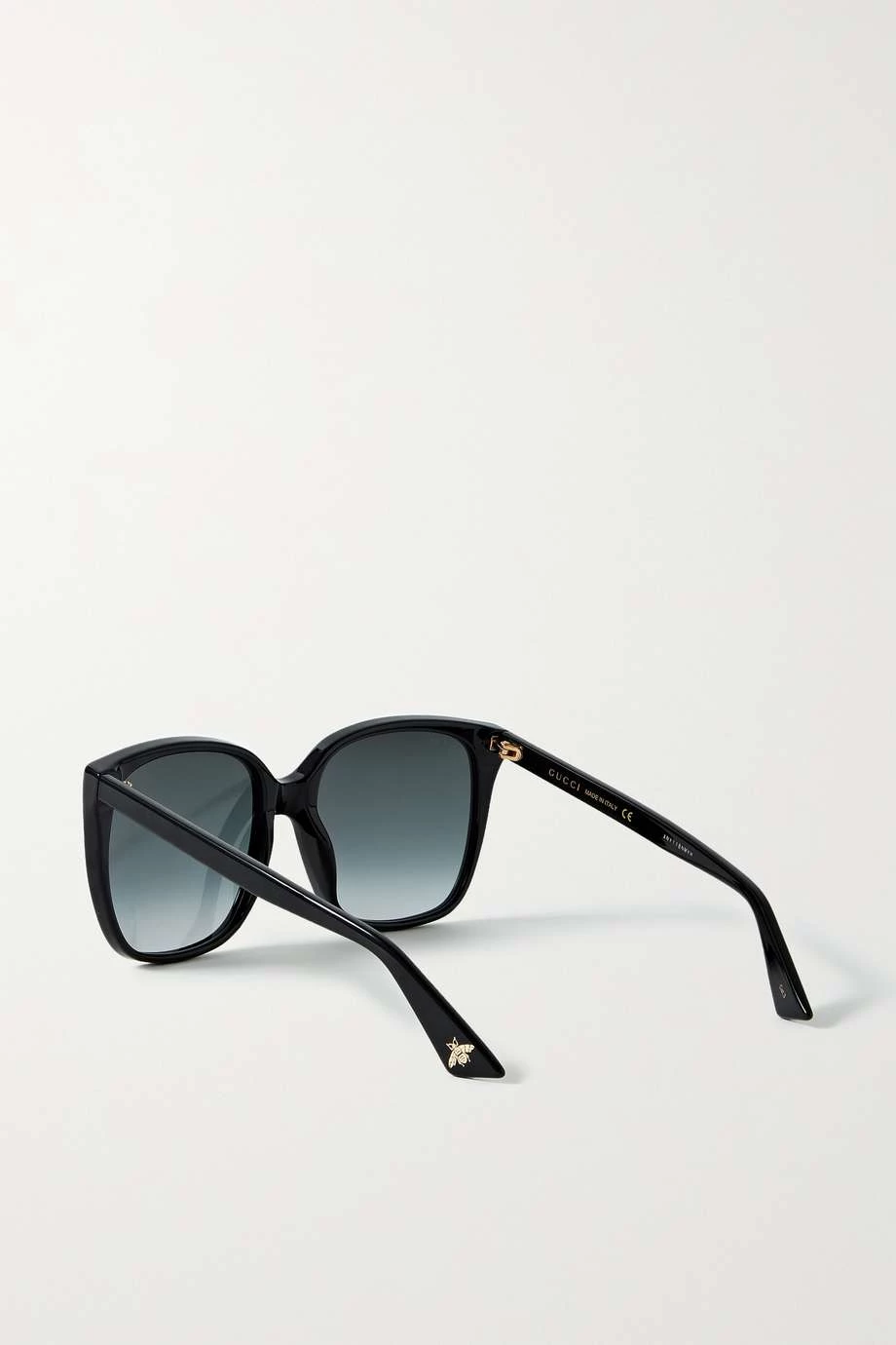 Diese Sonnenbrille von Gucci Eyewear wurde in Italien aus glänzendem schwarzem Azetat in einer D-Form gefertigt, die sich durch weichere, rundere Kanten auszeichnet. Das Accessoire ist zudem mit grauen Gläsern ausgestattet und an den Schläfen mit dem „GG“-Logo und den Bügelenden mit der ikonischen Biene verziert.