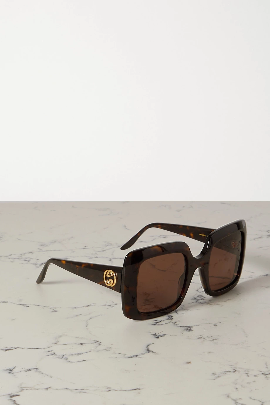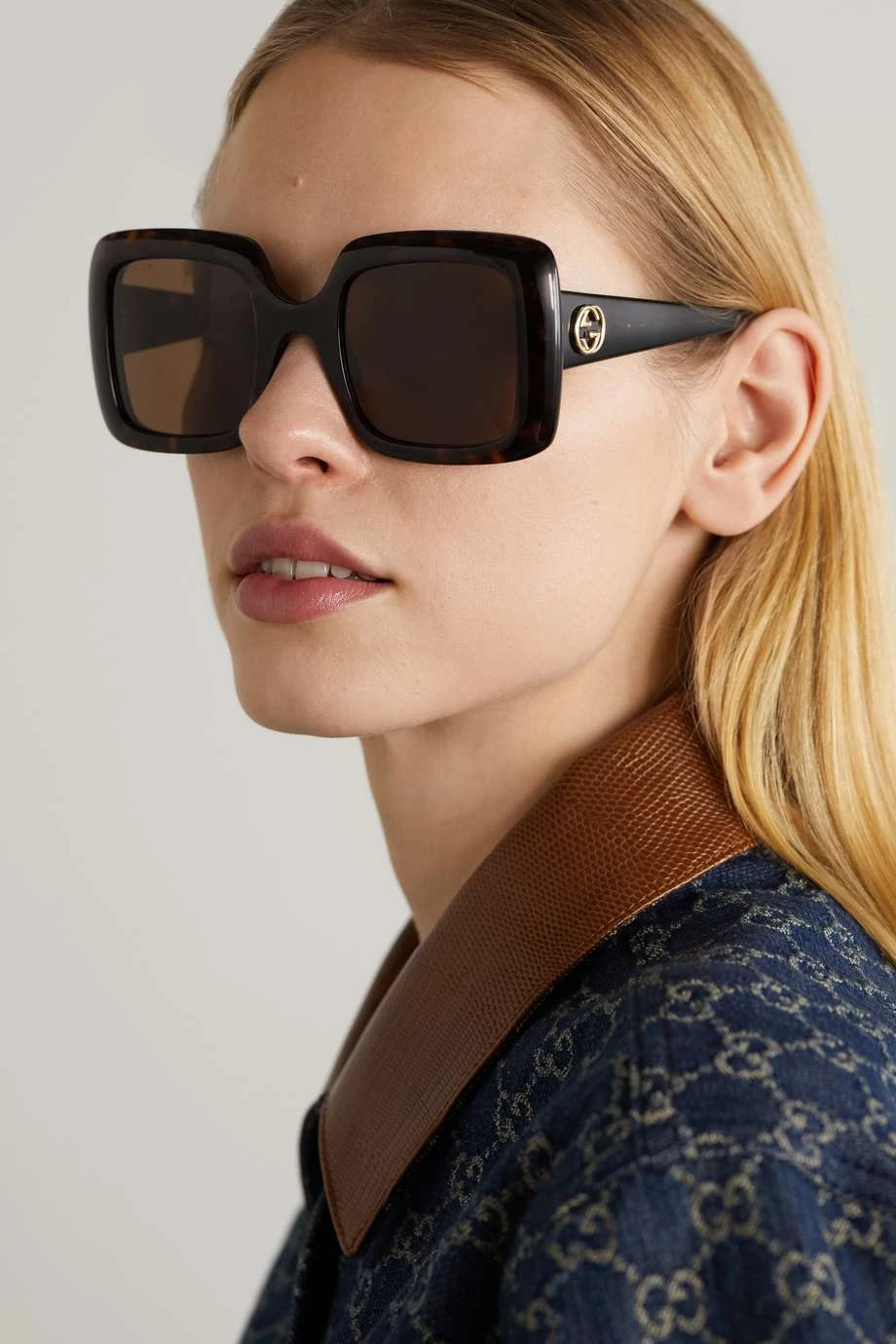 Diese Sonnenbrille von Gucci zeigt sich mit einem großen eckigen Rahmen im Retro-Stil. Sie wurde aus Azetat in dunkler Hornoptik gefertigt und mit braunen Gläsern ausgestattet. An den Bügeln ist das ikonische „GG“-Logo in Gold zu sehen. Unser Tipp: Mit auffälligem Lippenstift entsteht ein besonders cooler Look.