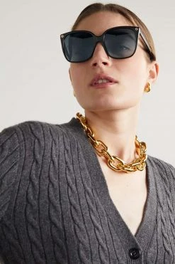 Diese Sonnenbrille aus Azetat in Hornoptik von Gucci wurde in Italien mit rundem Rahmen gefertigt, der eckigen Gesichtsformen besonders gut steht. Das Accessoire hat dunkelbraune Gläser mit Logoprägung und das ineinander verschränkte „GG“-Motiv der Marke an den Bügeln. Tragen Sie es im Urlaub zu einem Bikini und in der Stadt zu eleganten Einzelteilen.