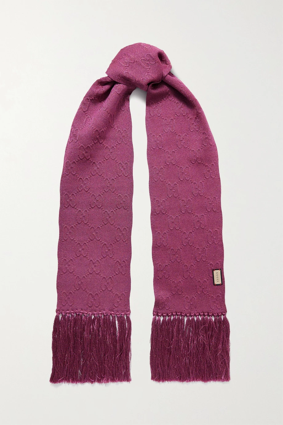Für die „Ouverture“ Kollektion von Gucci entwarf Alessandro Michele Designs, mit denen Sie die eigene Persönlichkeit zum Ausdruck bringen können. Der in Italien gefertigte „Fittizio“ Schal aus schimmerndem fuchsiafarbenem Lamé zeigt sich mit einem dezenten Jacquard-Muster aus dem „GG“-Logo der Marke sowie Fransen an den Enden. Verleihen Sie damit Mänteln in Beige oder Erdtönen eine fröhliche Note.