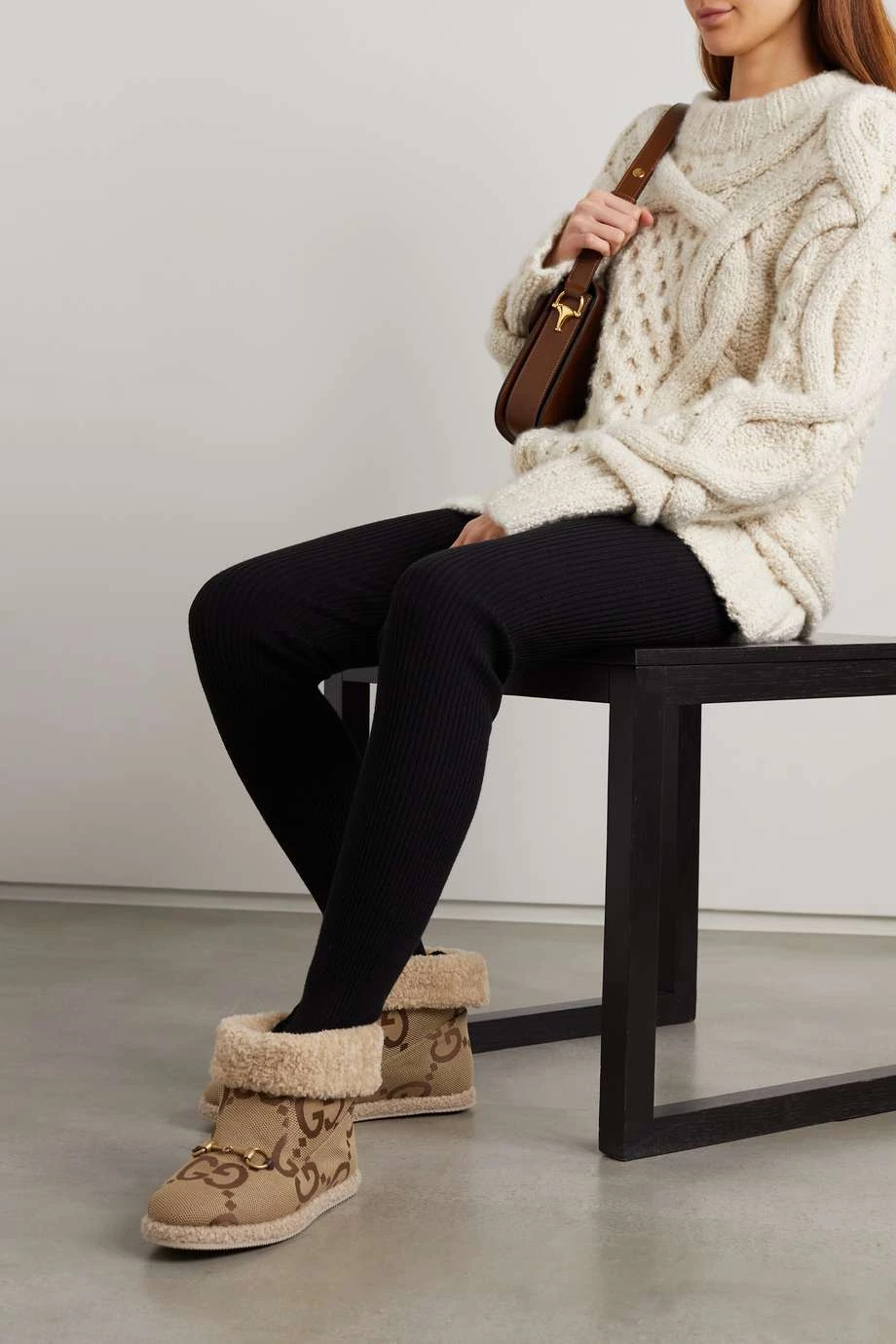 Die „Fria“ Ankle Boots von Gucci sind ebenso weich und bequem wie Hausschuhe. Sie wurden aus Canvas mit eingearbeitetem Logomuster gefertigt und mit einem kuscheligen Shearling-Futter sowie dem ikonischen „Horsebit“-Detail des Hauses gestaltet. Die Gummisohle mit Profil sorgt dabei für Halt.