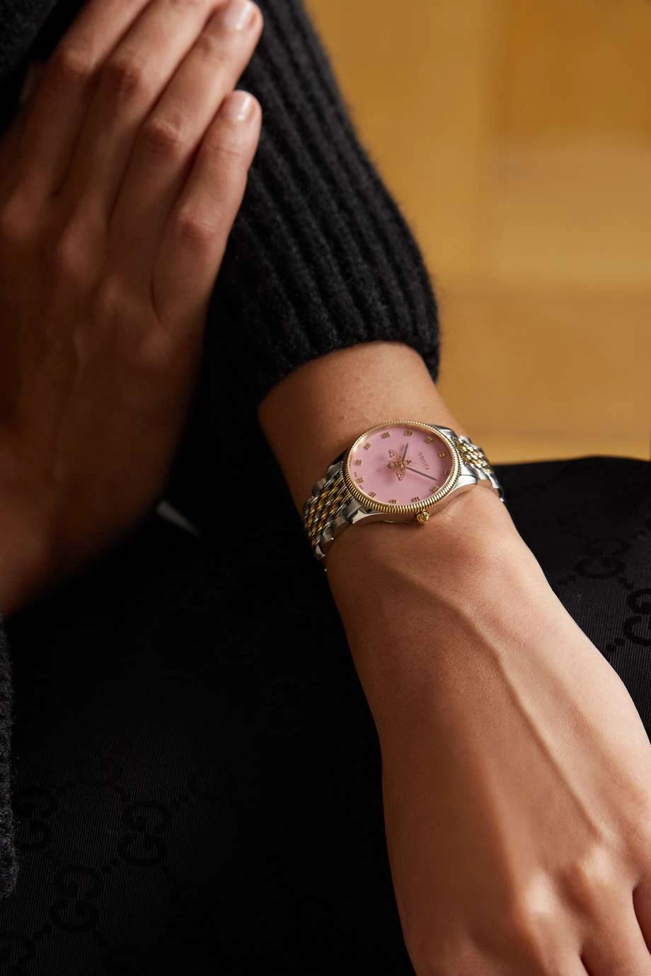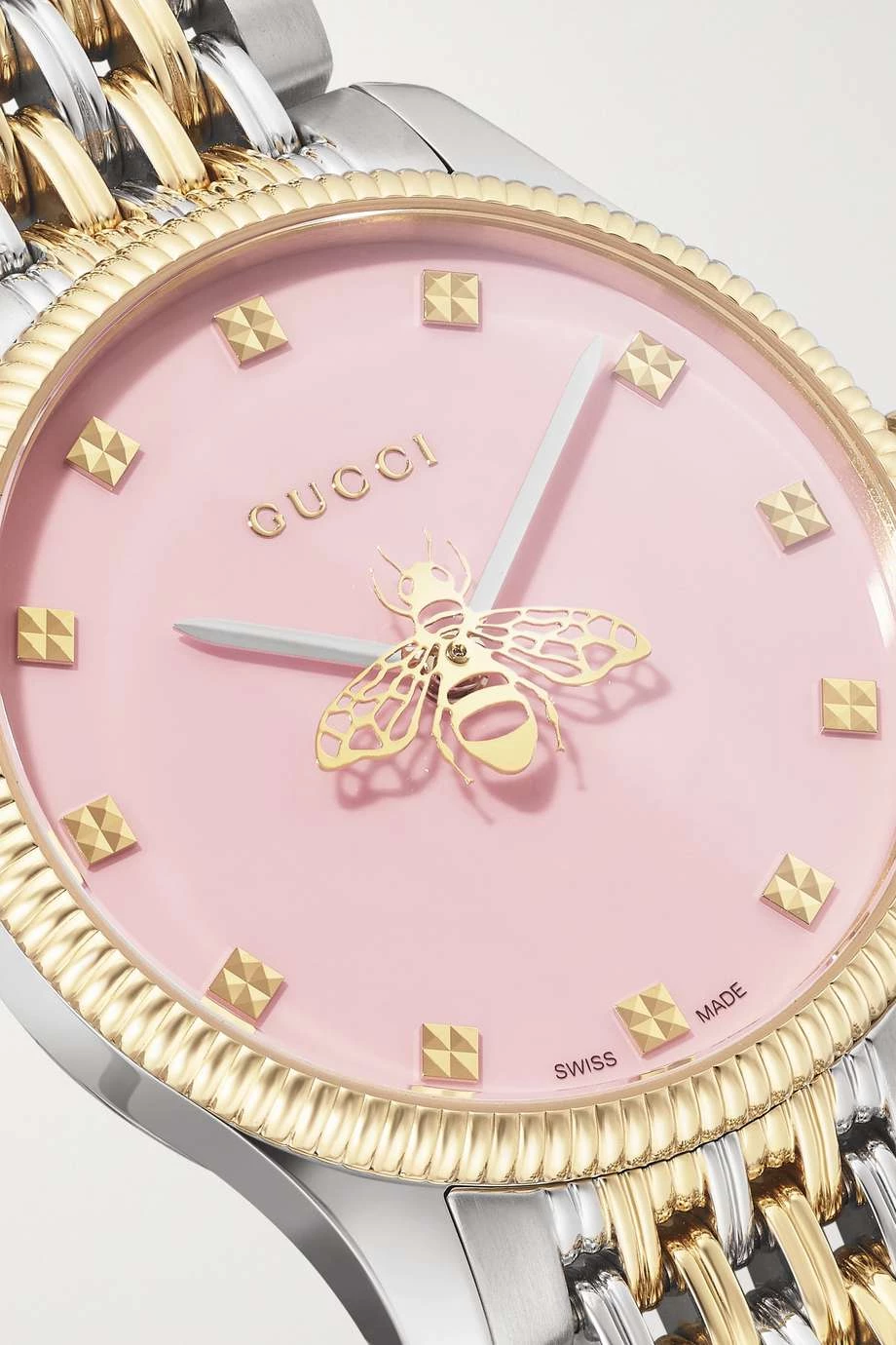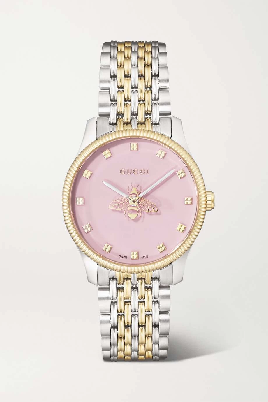 Die „G-Timeless“ Uhr wirkt wie etwas ganz Besonderes und ist wie gemacht für Fans von Gucci und des Kreativdirektors Alessandro Michele. Der Zeitmesser aus Edelstahl hat Partien mit PVD-Beschichtung aus Gold und ein rosafarbenes Zifferblatt. Er zeichnet sich außerdem durch einen Sekundenzeiger in Form einer Biene aus – das Insekt zählt zu den charakteristischen Motiven der Marke und findet sich auch als Gravur am Gehäuseboden.