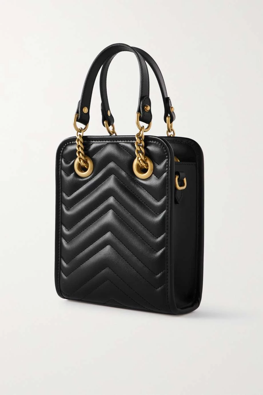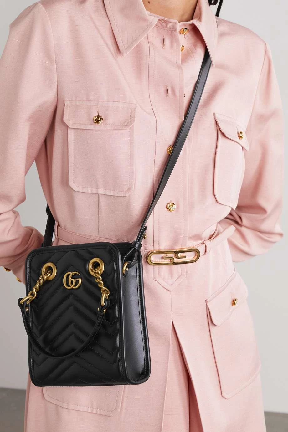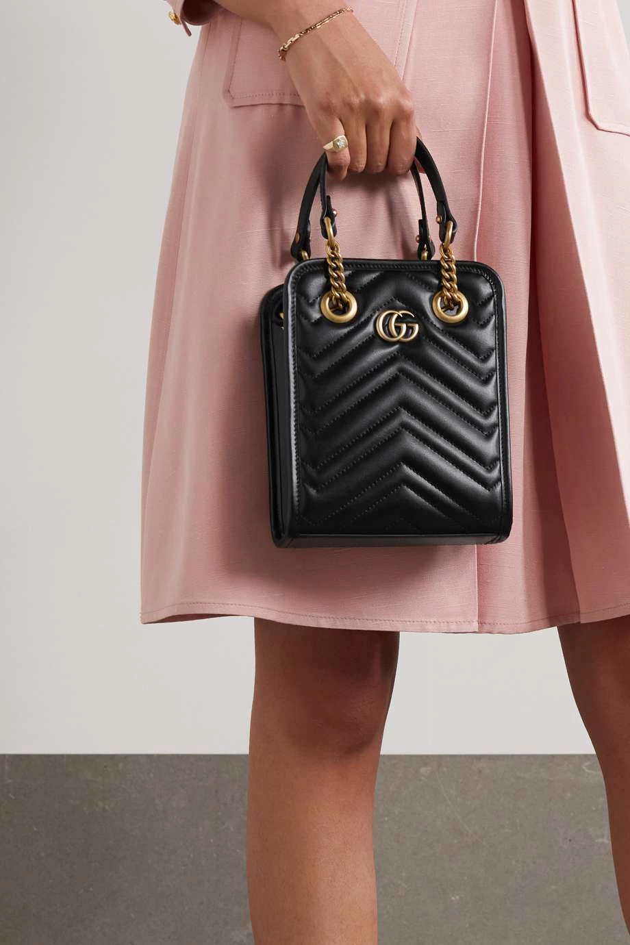 Die formstabile „GG Marmont 2.0“ Schultertasche in Minigröße von Gucci erinnert an Varianten aus den 90er-Jahren. Das Modell besteht aus Leder mit gestepptem Zickzackmuster und hat, typisch für die Marke, markante goldfarbene Details in Vintage-Optik.