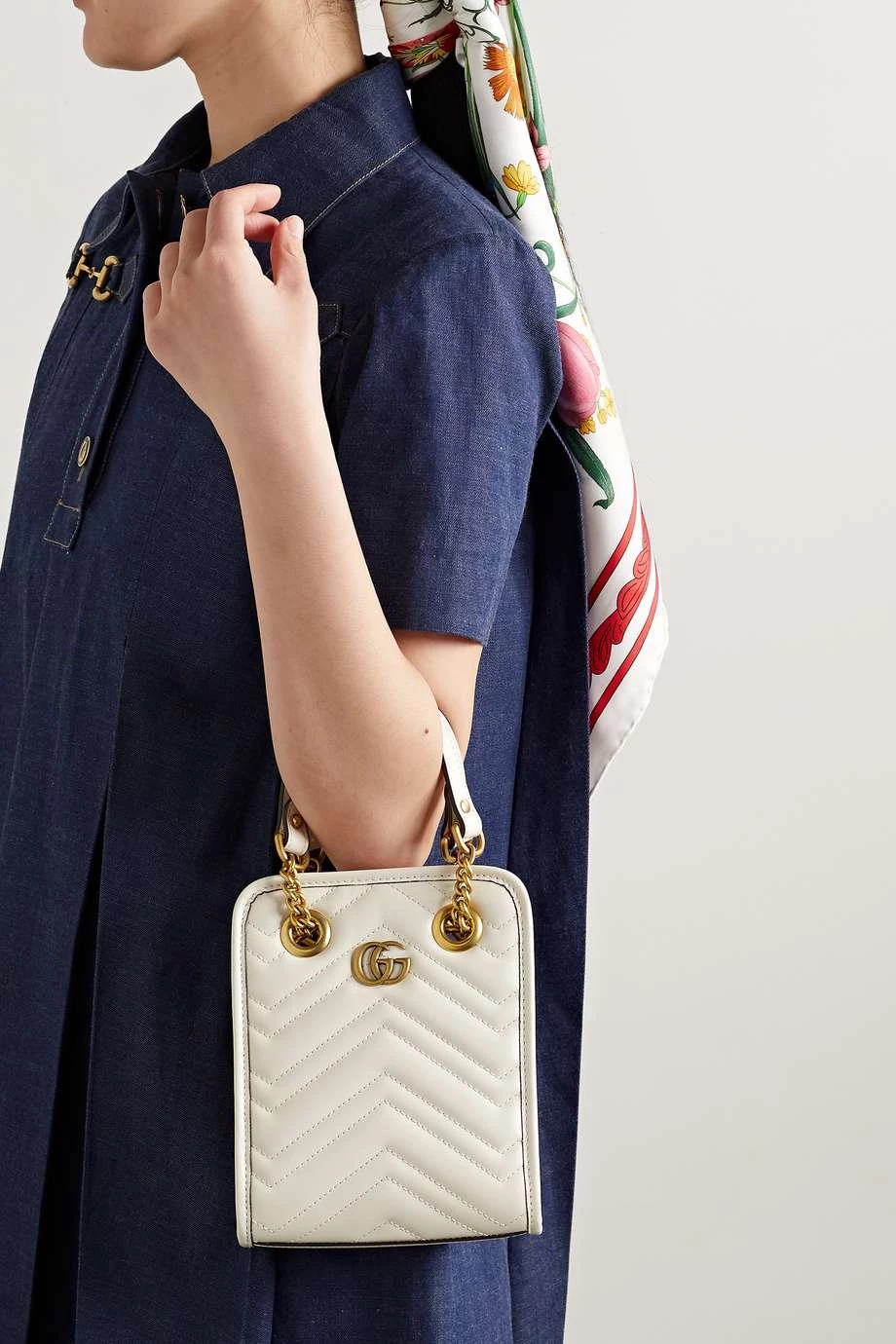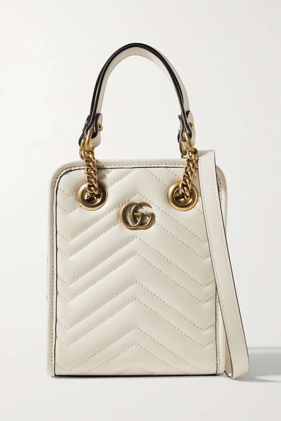 Die formstabile „GG Marmont 2.0“ Schultertasche in Minigröße von Gucci erinnert an Varianten aus den 90er-Jahren. Das Modell besteht aus Leder mit gestepptem Zickzackmuster und hat, typisch für die Marke, markante goldfarbene Details in Vintage-Optik.
