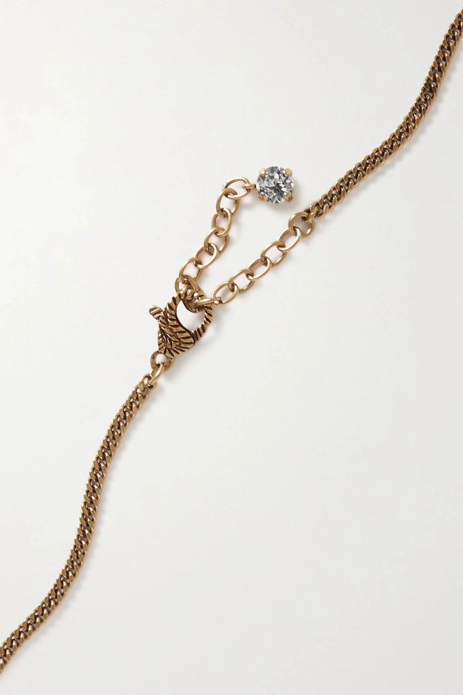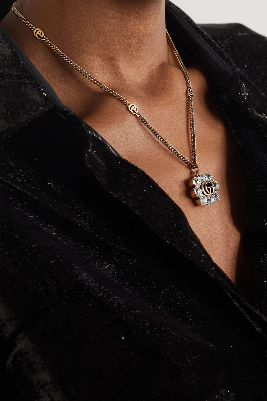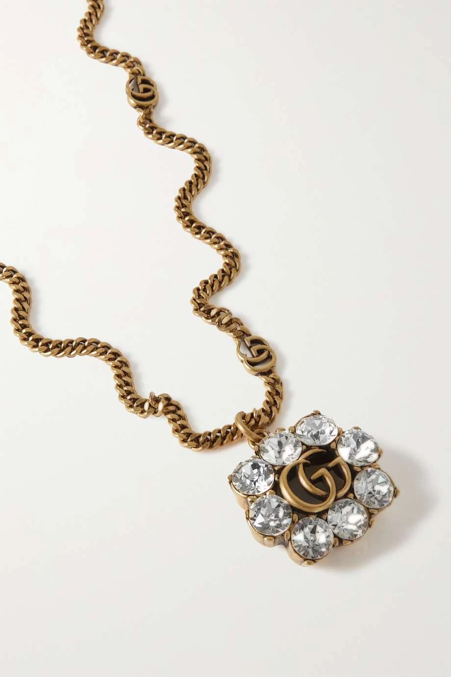 Diese Kette von Gucci besteht aus goldfarbenem Messing mit Vintage-Flair und hat einen Anhänger mit dem ikonischen „GG“-Logo der Marke, welches von funkelnden runden Kristallen gerahmt wird. Setzen Sie damit den V-Ausschnitt eines Pullovers oder einer Bluse in Szene.