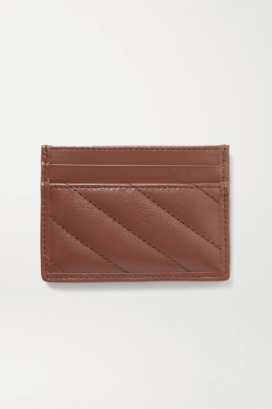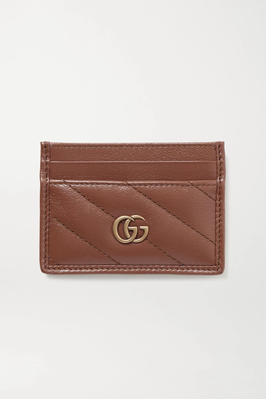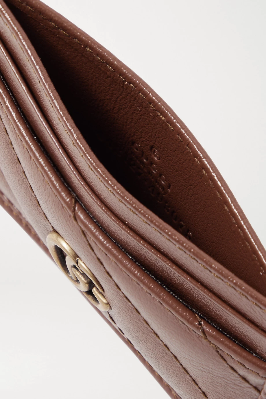 Dieses schmale Kartenetui von Gucci passt mühelos in eine Tote des Labels oder auch in die Hosentasche. Es besteht aus gestepptem Leder und hat vier Kartenschlitze sowie ein Mittelfach für Quittungen oder Tickets. Das brünierte „GG“-Detail stammt aus den Archiven des Labels.