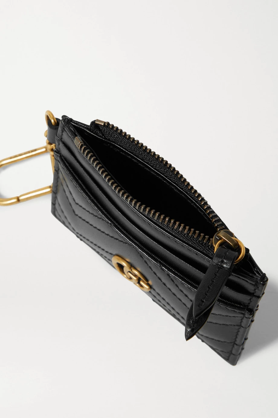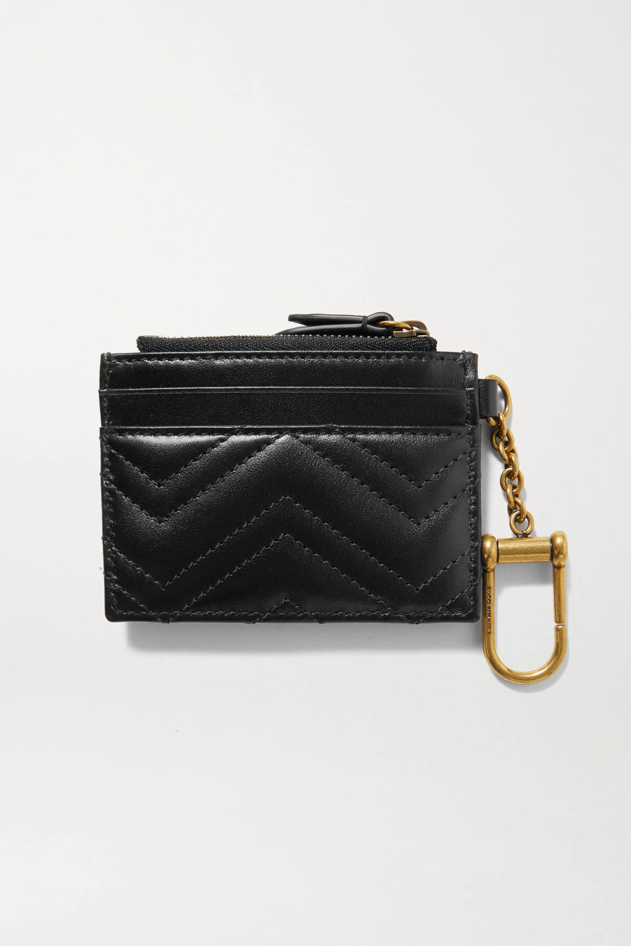 Das kompakte „GG Marmont“ Kartenetui von Gucci ist eine stylishe und leichte Alternative zu einem Portemonnaie – es bietet gerade genug Platz für Ihren Ausweis, die wichtigsten Karten und ein paar Münzen. Das in Italien gefertigte Modell aus schwarzem Leder ist mit zwei Markenzeichen des Hauses verziert: dem winkelförmigen Steppmuster und einem brünierten goldfarbenen Logodetail. Befestigen Sie es an einem Schlüsselring oder einer Tasche.