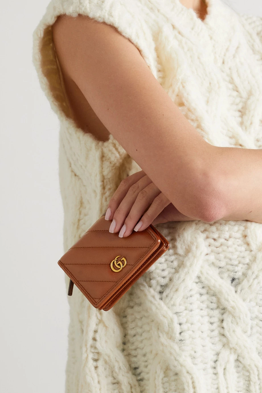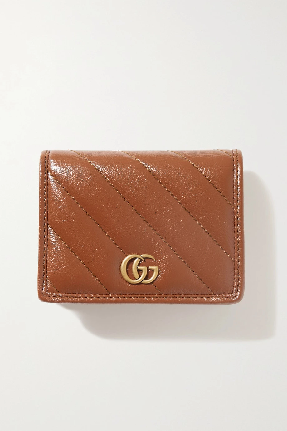 Dieses Portemonnaie von Gucci wurde mit Fächern für Kreditkarten und Münzen ausgestattet, weshalb es ideal ist, wenn Sie gerne beides dabei haben. Das in Italien gefertigte Accessoire besteht aus geschmeidigem braunem Leder mit dem ikonischen diagonalen Steppmuster und zeigt sich mit dem markentypischen „GG“-Detail.