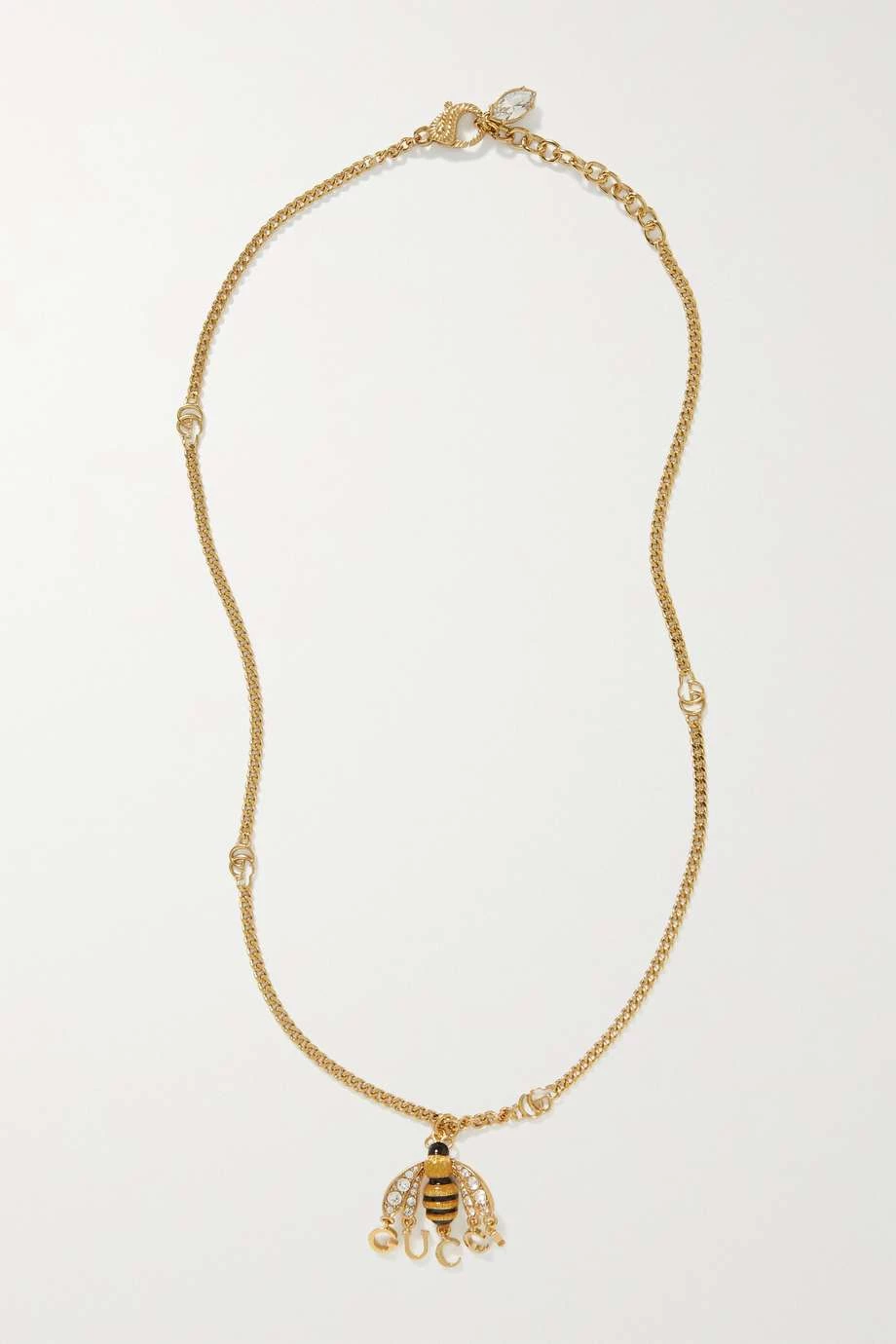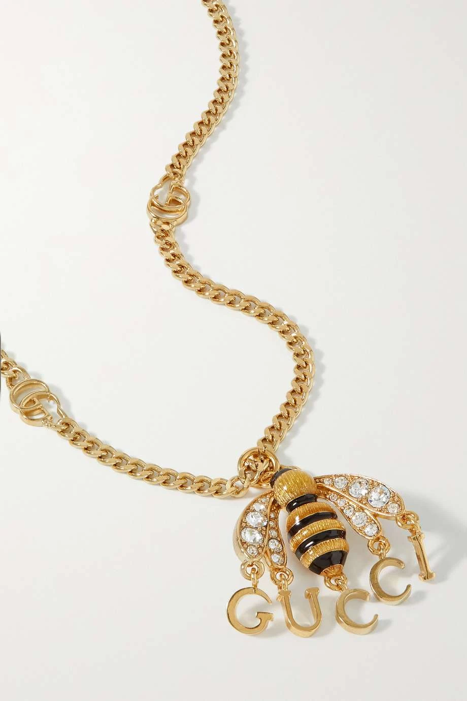 Diese Kette hat einen großen Bienenanhänger – jener ist seit den 70er-Jahren ein Markenzeichen von Gucci. Sie wurde aus goldfarbenem Metall gefertigt und mit Kristallen sowie glänzender Emaille versehen, während einzelne Buchstaben an der Unterseite den Namen des Hauses darstellen. Das „GG“-Logo zeigt sich ebenfalls entlang der Glieder.