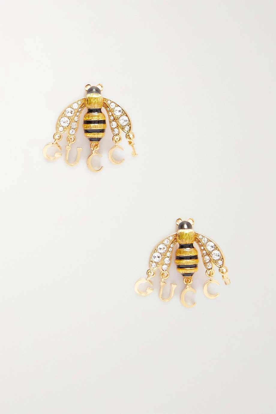 Seit Alessandro Michele bei Gucci die kreative Leitung innehat, tauchen in den Designs des Hauses immer wieder Tiere und Insekten auf. Diese goldglänzenden Ohrringe etwa haben die Form einer Biene, die in Europa gleichzeitig ein Symbol für Arbeitseifer und den Adel ist. Während die Streifen am Körper mit Emaille aufgemalt wurden, sind die Flügel mit funkelnden Kristallen besetzt – darunter baumeln Buchstabenanhänger, die den Markennamen ergeben.
