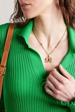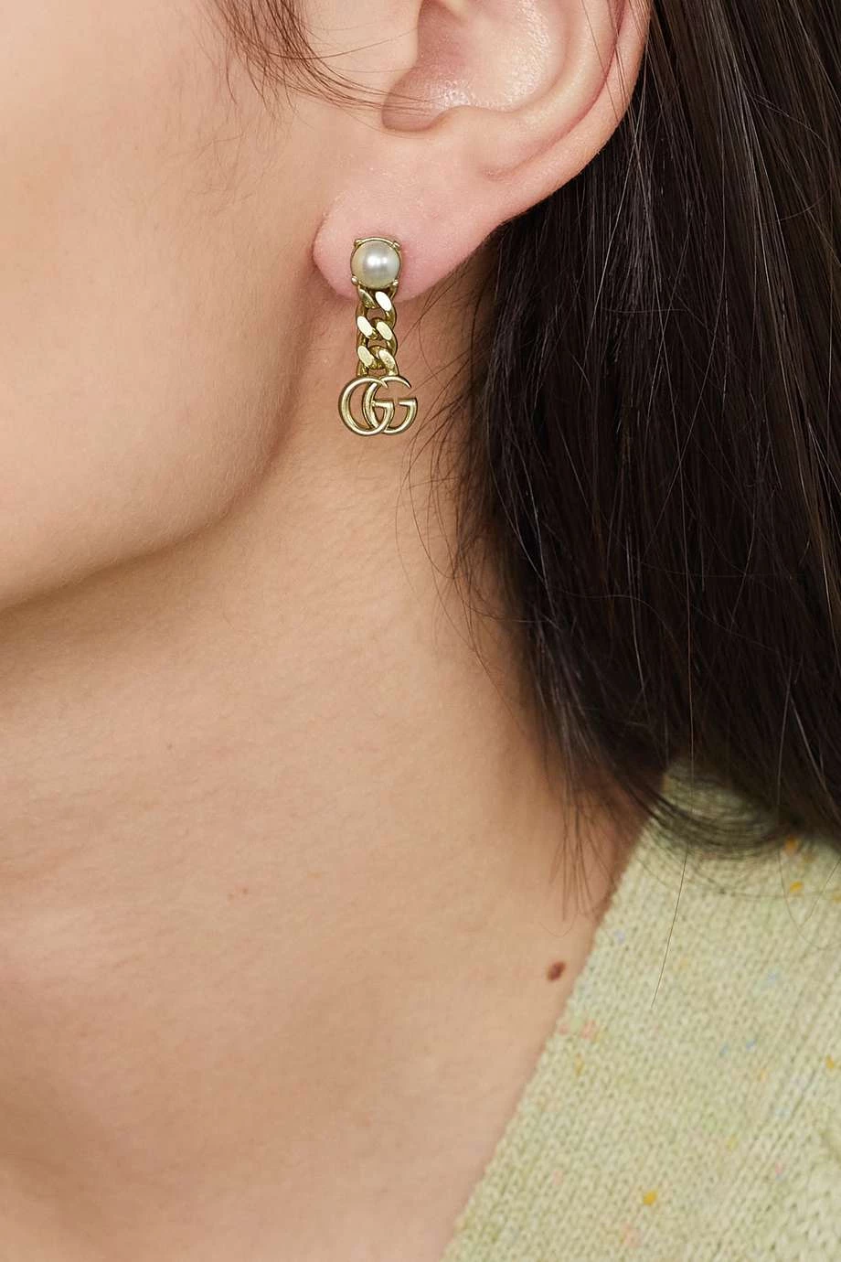 Diese Ohrringe von Gucci bestehen aus goldfarbenem Metall und zeigen sich an den Steckern mit glänzenden Kunstperlen. Ein Anhänger in Form des ikonischen „GG“-Logos der Marke baumelt dabei an den markanten Kettengliedern. Das Paar eignet sich sowohl für den Alltag als auch für den Abend.
