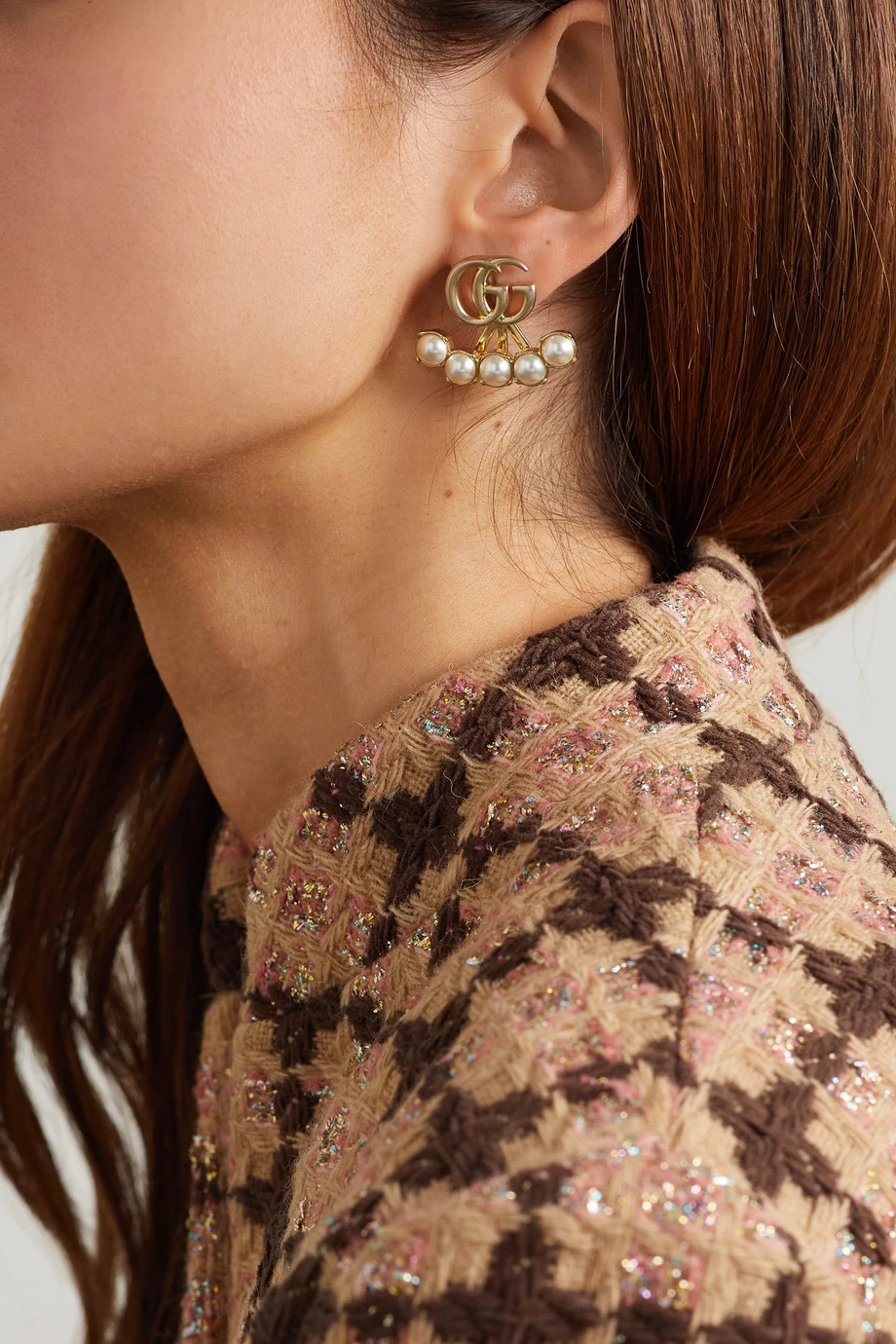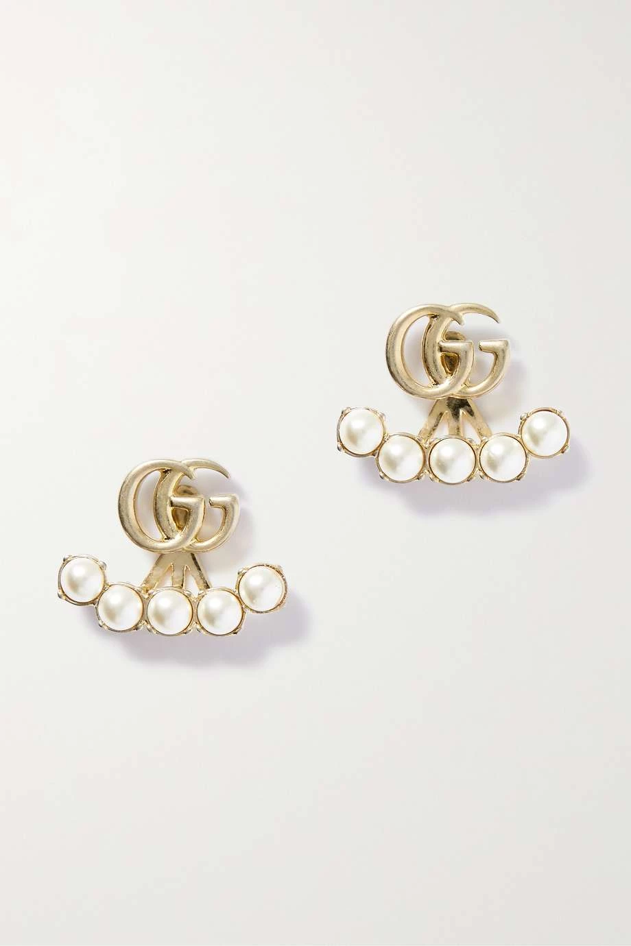 Diese Ohrringe von Gucci versprühen den Charme von Antiquitäten und sind ein Beispiel für Alessandro Micheles Hang zur Romantik. Das Paar wurde in Italien aus goldglänzendem Messing gefertigt und wie das Logo des Hauses gestaltet. Das Ear Jacket ist zudem mit Kunstperlen verziert.