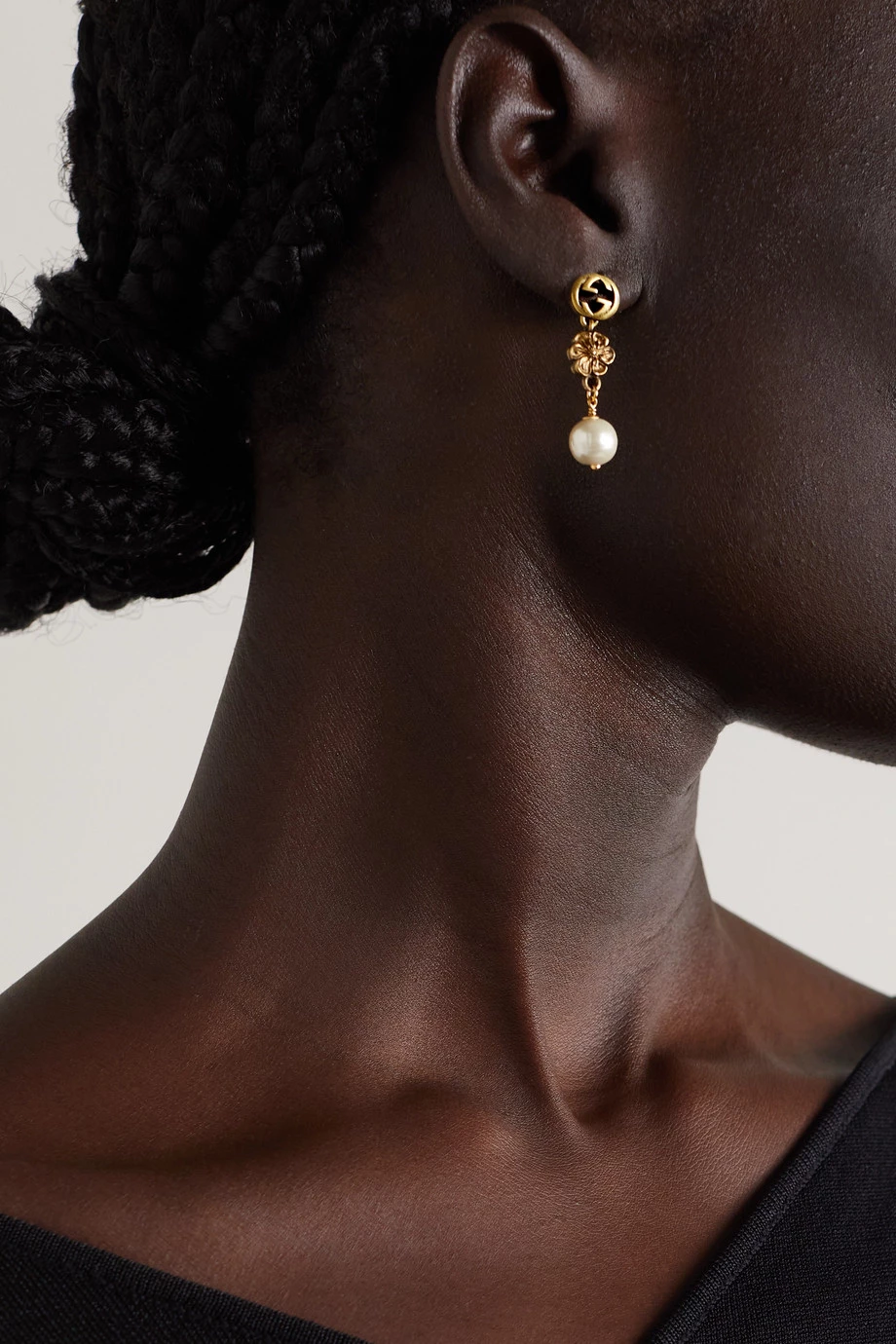Für den Schmuck der aktuellen Saison setzt Gucci auf natürliche Formen – diese Ohrringe etwa zeigen sich mit einem Blumenanhänger und Kunstperlen. Das in Italien gefertigte Paar besteht aus brüniertem goldfarbenem Metall und ist ausgesprochen leicht, weshalb Sie es den ganzen Tag lang tragen können.