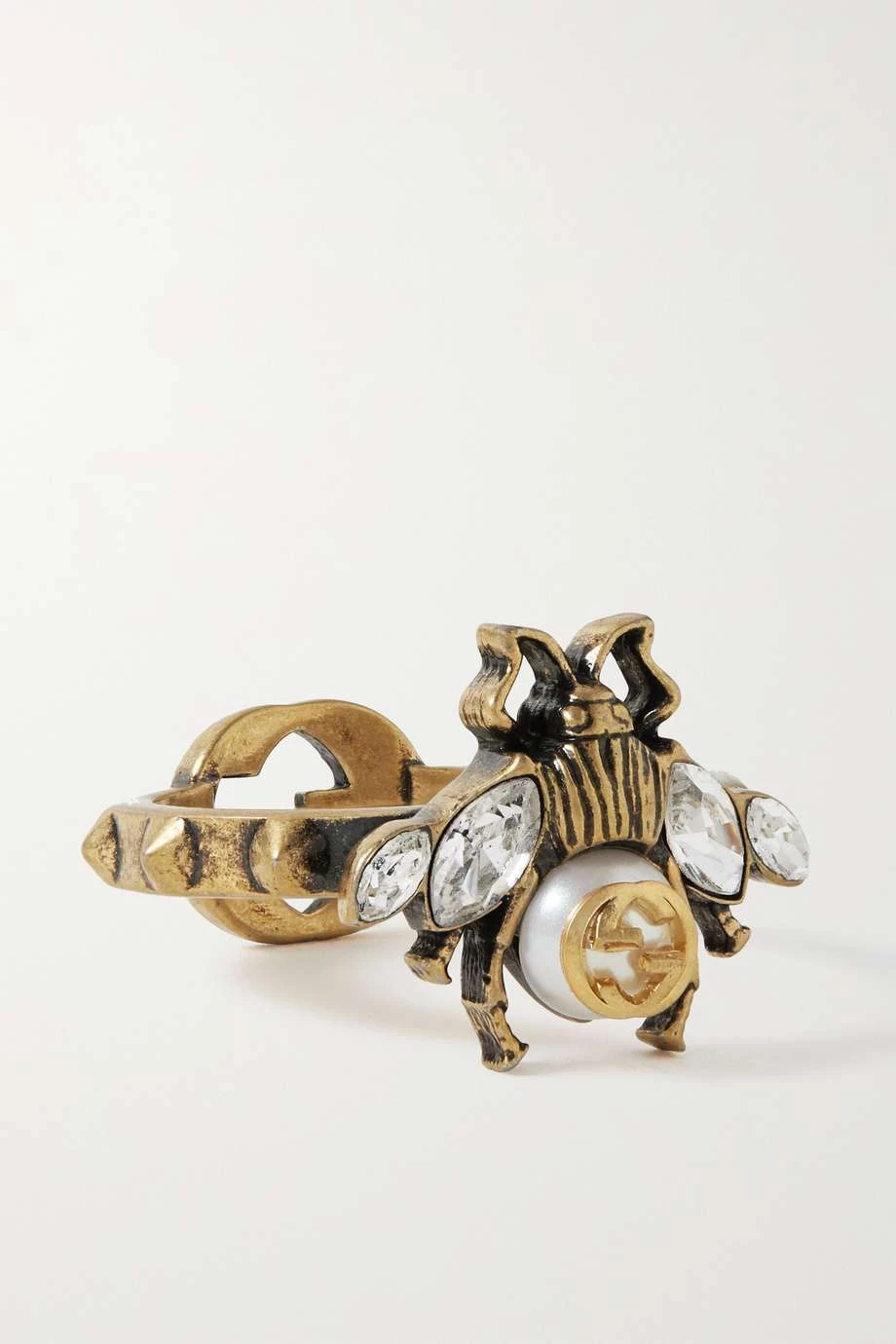 Die Biene von Gucci war erstmals in den 70er-Jahren zu sehen und gehört heute zu den wichtigsten Symbolen der Marke. Dieser Ring aus goldfarbenem Metall wurde ebenfalls in die Form des Insekts gebracht und an den Flügeln mit Kristallen besetzt, wobei eine schimmernde Kunstperle in der Mitte platziert wurde. Am unteren Teil der Schiene findet sich zudem das unverkennbare „GG“-Detail des Hauses.