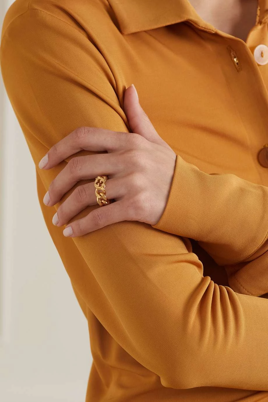 Die „Gourmette“ Gliederkette von Gucci war ursprünglich Teil der „Aria“ Kollektion – in dieser Saison ist sie wieder auf diversen Schmuckstücken und Accessoires, wie diesem Ring, zu sehen. Das Modell wird mit dem charakteristischen „GG“-Logo abgerundet.