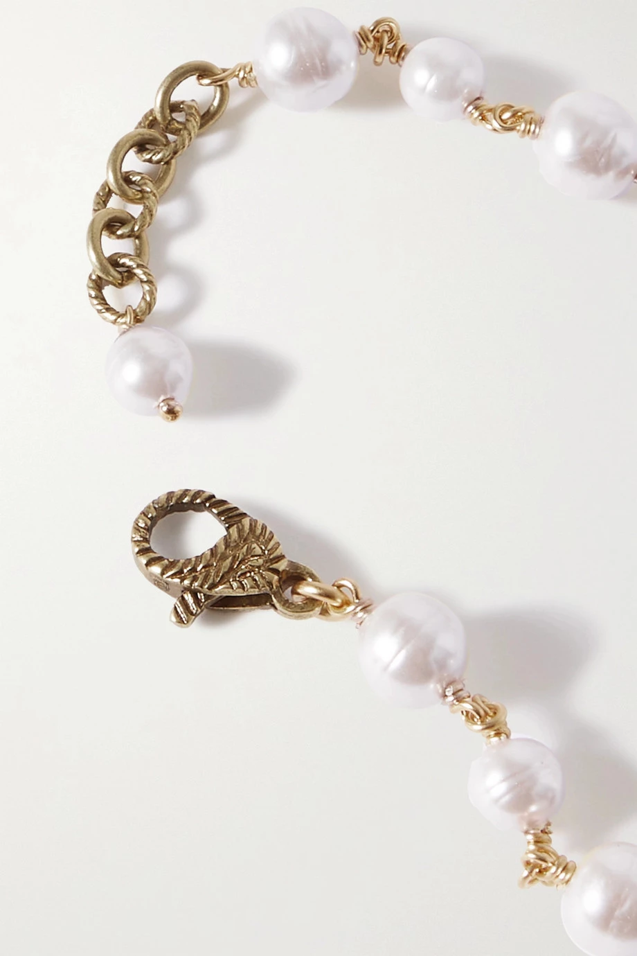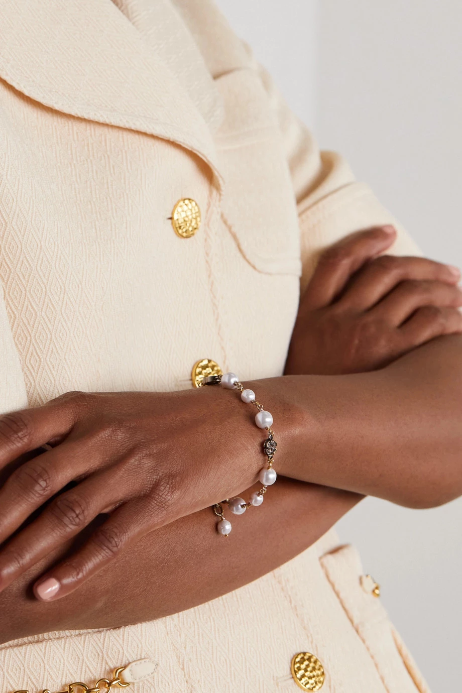 Dieses goldfarbene Armband von Gucci zeigt sich mit Kunstperlen und Elementen in Form einer Blüte und des ikonischen „GG“-Logos. Befestigen Sie es über der Manschette eines Hemds und tragen Sie die passende Kette dazu.