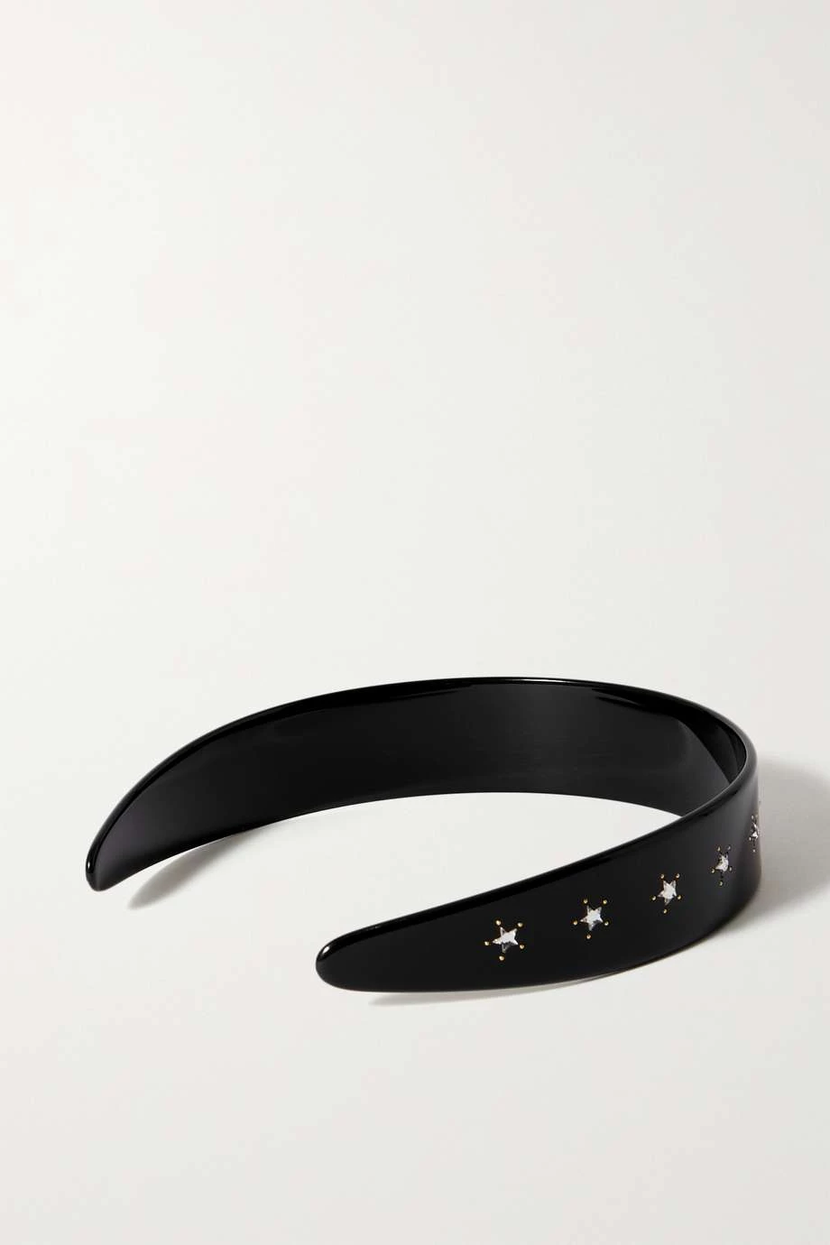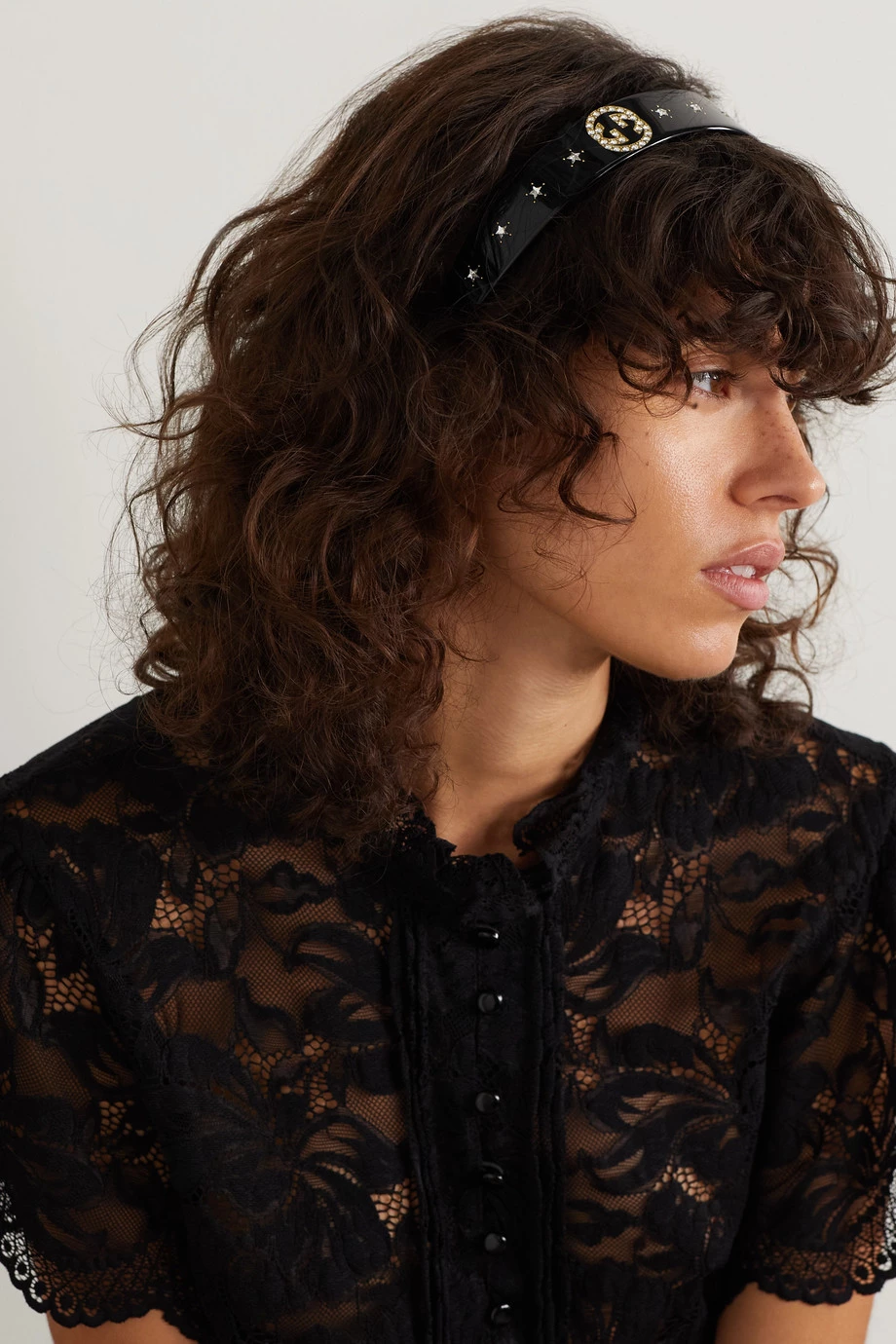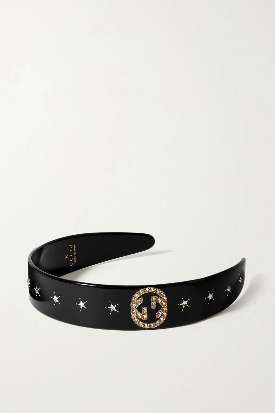 Dieser Haarreif von Gucci wurde in Italien aus glänzendem Harz gefertigt – aufgrund der biegsamen und ebenmäßigen Beschaffenheit des Materials verfängt sich Ihr Haar nicht darin. Zudem ist das Accessoire mit einer kristallbesetzten Ausführung des „GG“-Logos sowie funkelnden Sternen verziert.