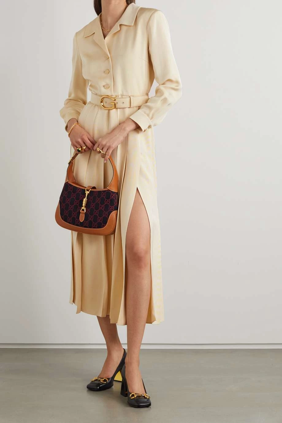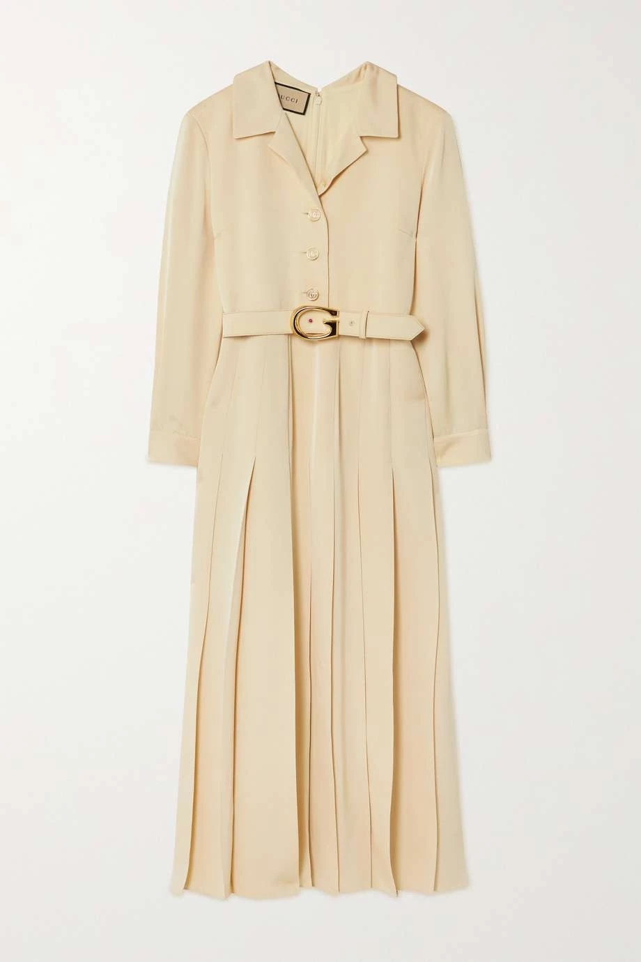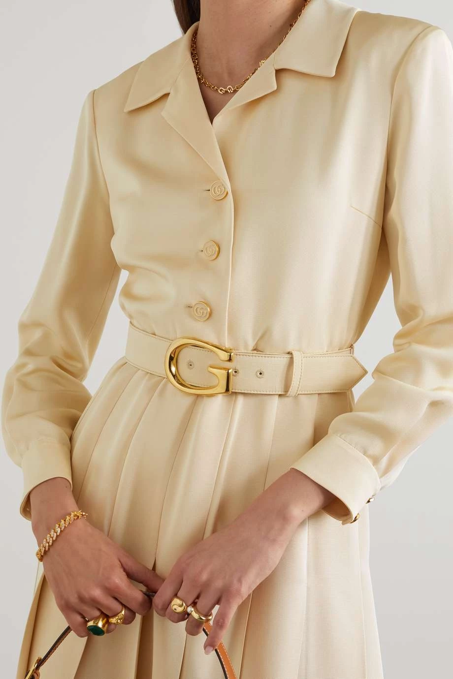 Alessandro Michele von Gucci lässt sich häufig von den 70er-Jahren inspirieren – dieses Hemdblusenkleid etwa fängt das Flair jenes Jahrzehnts auf elegante Weise ein. Das Modell besteht aus glänzender Faille in Creme und hat einen Reverskragen sowie einen in Falten gelegten Rock. Bei genauem Hinsehen wird die „GG“-Logoprägung an den Knöpfen deutlich.