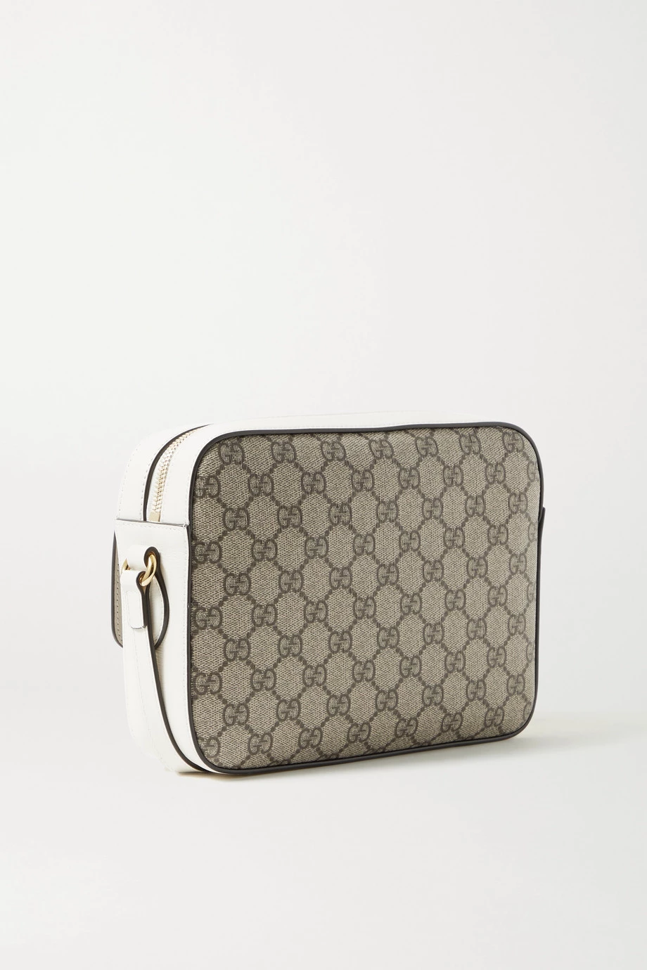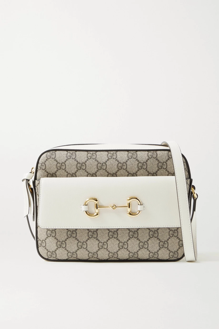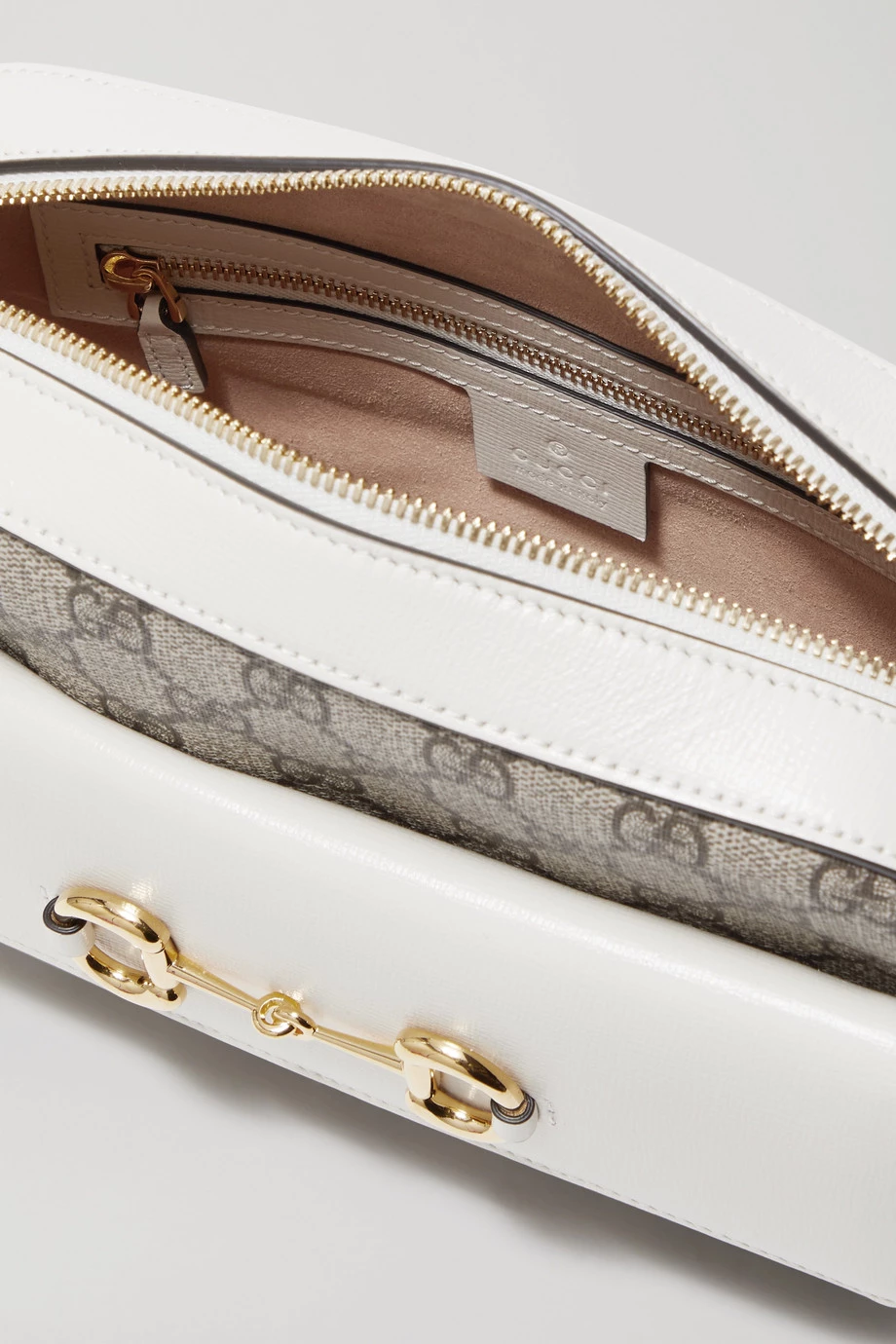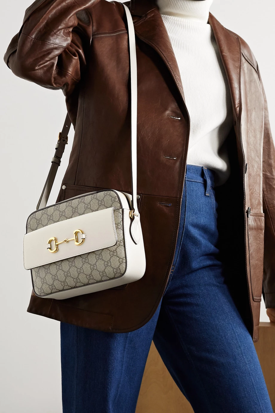 Diese kastenförmige Neuinterpretation der „1955“ Tasche von Gucci weist zwei Markenzeichen des Hauses auf: Das goldglänzende Horsebit-Detail und das charakteristische „GG Supreme“-Muster des Labels, mit dem der beschichtete Canvas bedruckt ist. Das Modell mit Besätzen aus Glattleder wurde in Italien gefertigt und hat eine praktische Pattentasche an der Vorderseite, in der Smartphone oder Schlüssel griffbereit aufbewahrt werden können. Der lange Schulterriemen lässt sich außerdem verstellen.