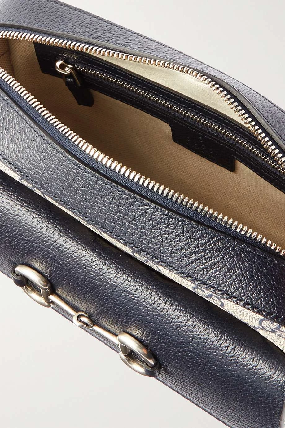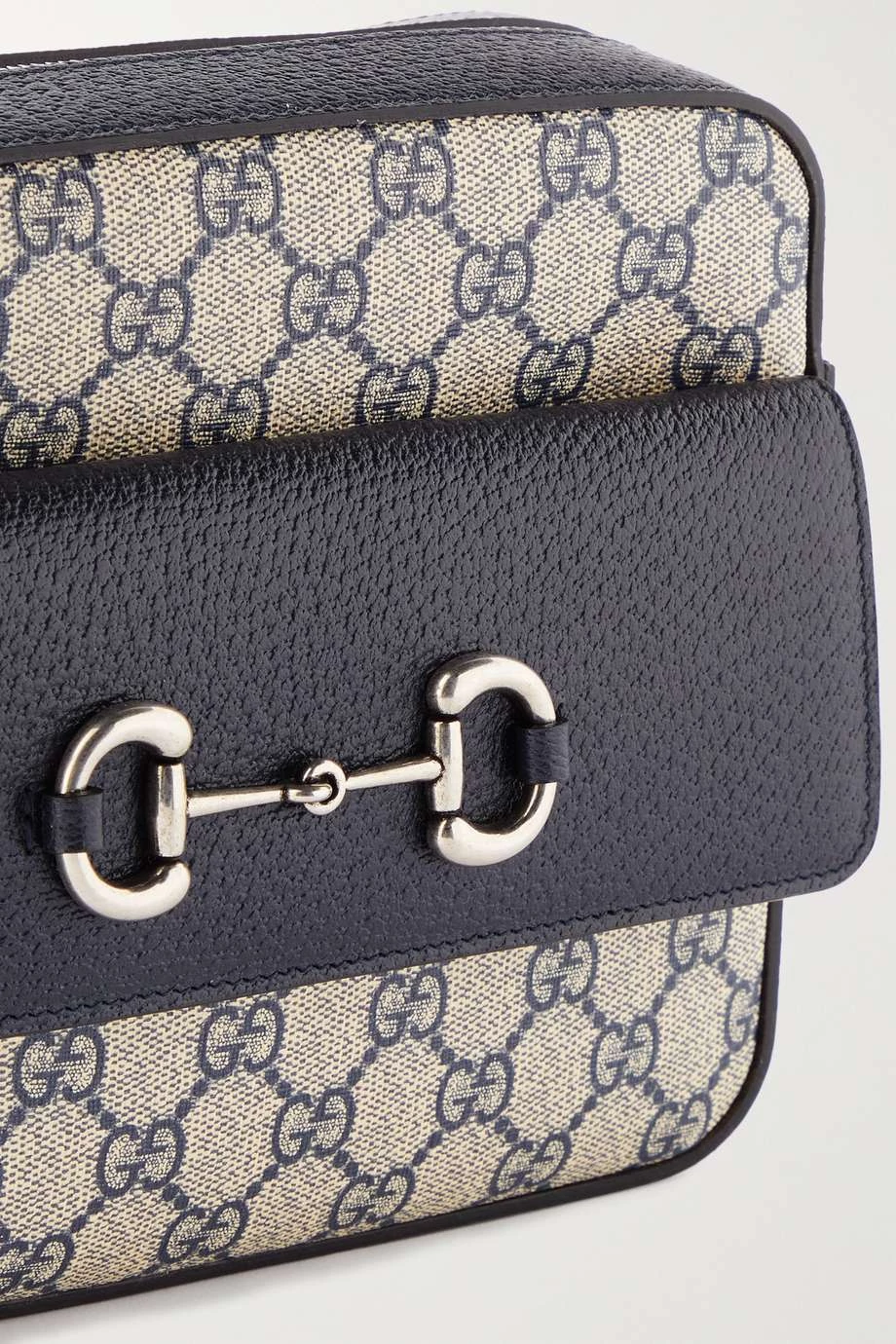 Diese kastenförmige Neuinterpretation der „1955“ Tasche von Gucci weist zwei Markenzeichen des Hauses auf: Das Horsebit-Detail und den charakteristischen Canvas mit „GG Supreme“-Muster des Labels. Das Modell mit Besätzen aus Glattleder wurde in Italien gefertigt und hat eine praktische Pattentasche an der Vorderseite, in der Smartphone oder Schlüssel griffbereit aufbewahrt werden können. Der lange Schulterriemen lässt sich außerdem verstellen.
