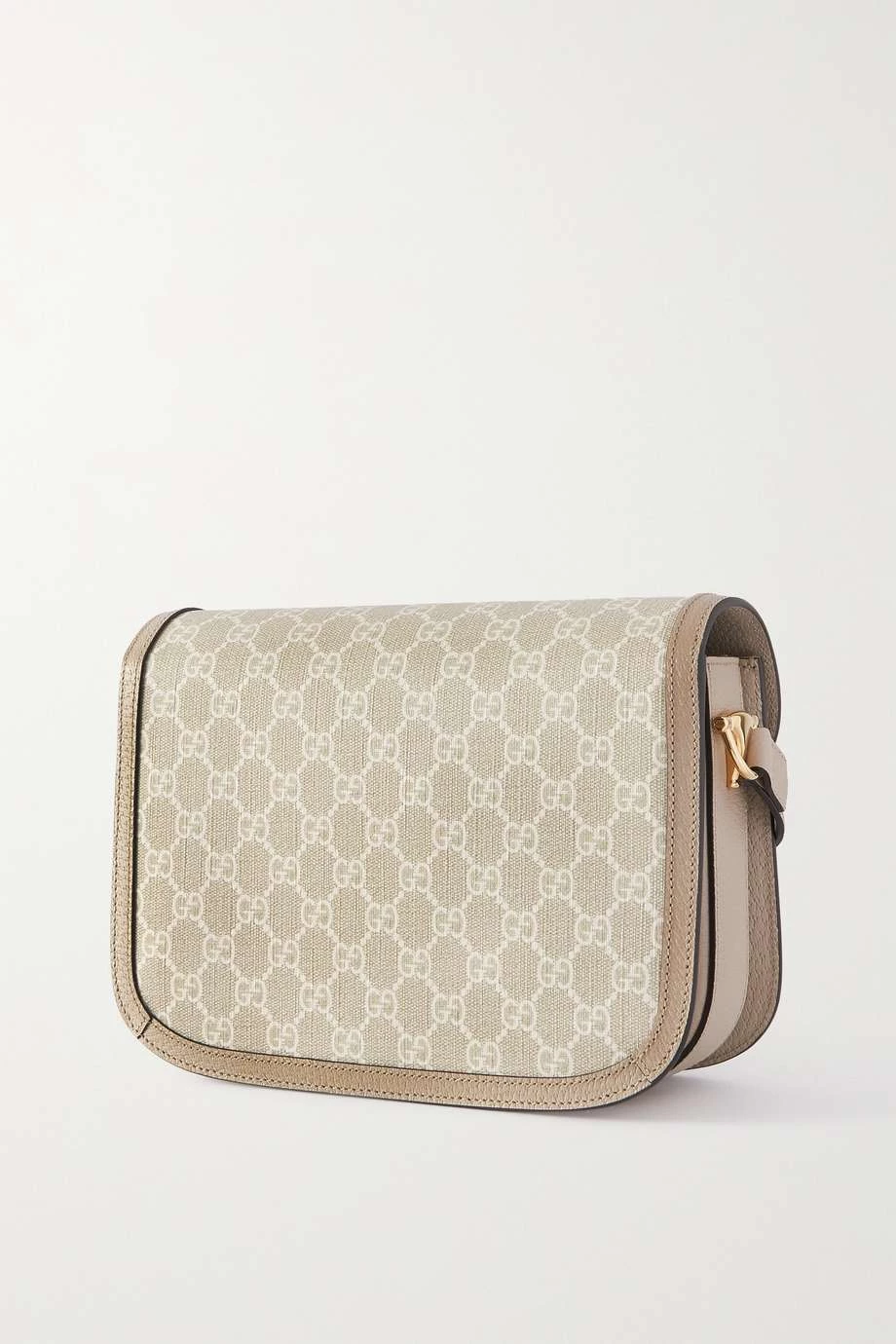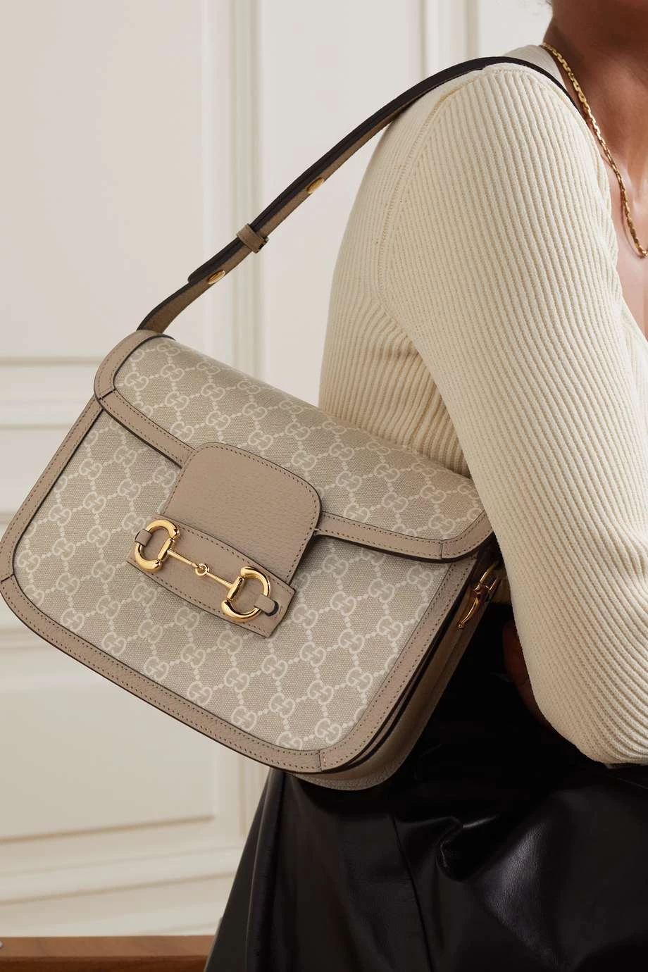 Diese überarbeitete Version der „1955 Horsebit“ Schultertasche von Gucci wurde bereits von Berühmtheiten wie Sienna Miller, Adwoa Aboah und Alexa Chung getragen. Das Accessoire in Form einer Satteltasche wurde in Italien aus beschichtetem Canvas gefertigt, der mit dem charakteristischen Labellogo bedruckt ist, und zeigt sich mit kieselgrauen Lederbesätzen. Stimmen Sie Ihren Schmuck auf das goldfarbenene „Horsebit“-Detail ab.