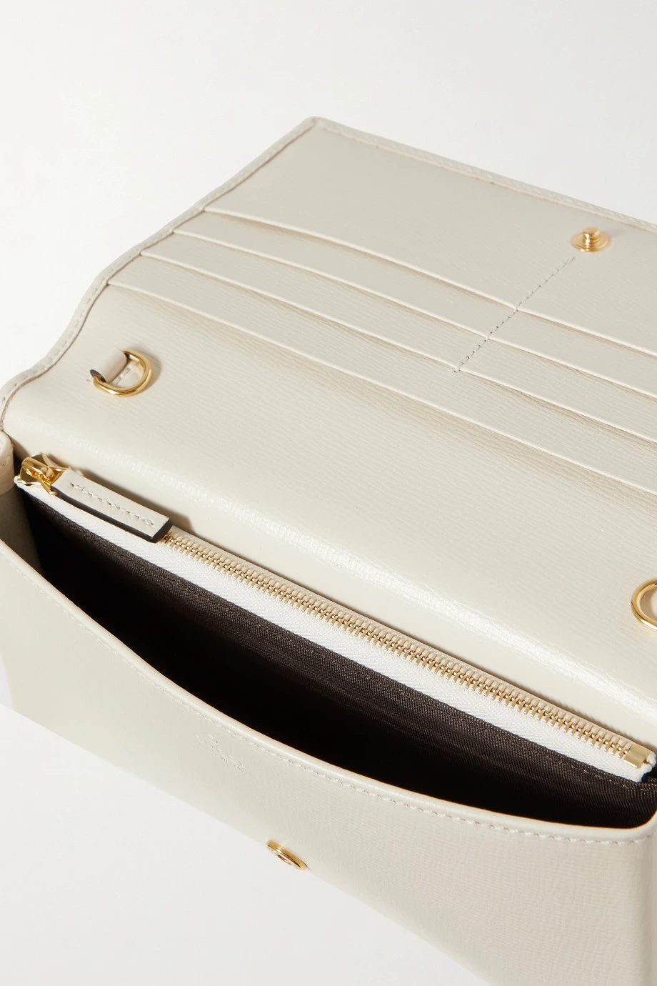 Diese Schultertasche von Gucci ist Teil der „Horsebit 1955“ Kollektion, die in Anlehnung an Modelle aus dem eindrucksvollen Archiv des Hauses entstand. Das Accessoire wurde in Italien aus beschichtetem Canvas gefertigt, der mit dem unverkennbaren „GG“-Logo bedruckt und mit weißem strukturiertem Leder besetzt ist. Im Inneren befinden sich sechs Kartenschlitze, ein zentrales Mittelfach mit Reißverschluss sowie eines für Smartphone und Schlüsselbund.